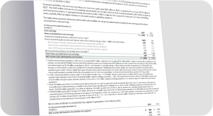 In the U.S., core earnings were $374 million in 4Q22 compared with $467 million in 4Q21. The 25% decrease on a constant exchange rate basis was due to lower core earnings in both Annuities and Insurance. The decline in Annuities core earnings was driven by reduced in-force earnings of $55 million related to the two transactions to reinsure over 80%1 of our U.S. variable annuity block in 2022. Annuities core earnings were also impacted by lower in-force earnings from unfavourable equity markets and lower policyholder experience gains. Insurance core earnings were lower primarily due to lower new business gains and lower other experience gains, partially offset by more favourable long-term care policyholder experience. Life insurance policyholder experience was neutral compared with 4Q21. In addition, higher investment income on allocated capital increased core earnings by US$6 million compared with 4Q21 (see Corporate and Other segment). Global WAM core earnings were $267 million in 4Q22 compared with $387 million in 4Q21. The 34% decrease was driven by a decline in net fee income from lower average AUMA due to higher interest rates and equity market declines in 2022, and the non-recurrence of favourable tax benefits in 4Q21. Corporate and Other core earnings excluding core investment gains were $86 million in 4Q22 compared with core loss of $79 million in 4Q21. The $165 million increase in core earnings was primarily due to higher yields on fixed income investments, $53 million of gains on seed money investments in segregated funds and mutual funds in 4Q22 compared with losses in the prior year and lower withholding taxes, partially offset by higher interest on allocated capital to operating segments. The table below presents net income attributed to shareholders for the periods presented consisting of core earnings and the items excluded from core earnings. For the quarters ended December 31, ($ millions) 2022 2021 Core earnings $ 1,746 $ 1,708 Items excluded from core earnings: (1) Investment-related experience outside of core earnings (457) 126 Direct impact of equity markets and interest rates and variable annuity guarantee liabilities (see table below) 184 398 (2) Directimpactofequitymarketsandvariableannuityguaranteeliabilities 109 124 (3) Fixedincomereinvestmentratesassumedinthevaluationofpolicyliabilities 130 454 SaleofAFSbondsandderivativepositionsintheCorporateandOthersegment (55) (180) (4) Reinsurance transactions, tax-related items and other 418 (148) Total items excluded from core earnings 145 376 Net income (loss) attributed to shareholders $ 1,891 $ 2,084 (1) Total investment-related experience in 4Q22 was a net charge of $357 million, compared with a net gain of $226 million in 4Q21, and in accordance with our definition of core earnings, we included $100 million in investment-related experience gains in core earnings and a $457 million loss in items excluded from core earnings in 4Q22 ($100 million in investment gains and $126 million, respectively, in 4Q21). Investment-related experience charge in 4Q22 reflected lower-than-expected returns (including fair value changes) on ALDA related to real estate, partially offset by the favourable impact of fixed income reinvestment activities and strong credit experience. Investment-related experience gains in 4Q21 reflected higher-than-expected returns (including fair value changes) on ALDA primarily driven by gains on private equity and infrastructure as well as strong credit experience, partially offset by the unfavourable impact of fixed income reinvestment activities primarily driven by the acquisition of US Treasury bills. (2) In 4Q22, the net gain related to equity markets of $109 million included a gain of $126 million from gross equity exposure, partially offset by a loss of $14 million from dynamic hedge experience and a modest charge of $3 million from macro hedging experience. In 4Q21, the net gain related to equity markets of $124 million included a gain of $145 million from gross equity exposure, partially offset by a loss of $20 million from dynamic hedging experience and a modest charge of $1 million from macro hedge experience. (3) The $130 million gain in 4Q22 due to fixed income reinvestment rates was driven by gains due to the flattening of the yield curve in the U.S. and Canada and the impact of favourable equity market performance, partially offset by losses from corporate spread movements across several markets of differing magnitudes and from the sale of AFS bonds. The $454 million gain in 4Q21 was driven by flattening of the yield curve in Canada and the U.S. and, to a lesser extent, widening corporate spreads in the U.S. (4) The $418 million gain in 4Q22 includes $297 million related to the favourable impact of an increase in the Canadian corporate tax rate, $86 million net gain from acquiring full ownership interest of MTEDA by purchasing the remaining 51% of shares from our joint venture partner and a $35 million gain from a reinsurance transaction in the U.S. 4Q21 includes a $119 million charge related to updating the impact of the 2017 U.S. Tax Cuts and Jobs Act and a $37 million charge from a reinsurance transaction in the U.S., partially offset by Asia reinsurance transaction gains of $8 million in 4Q22. Net income attributed to shareholders by segment is presented in the following table. For the quarters ended December 31, ($ millions) 2022 2021 Net income attributed to shareholders by segment Asia $ 569 $ 645 Canada 320 616 U.S. 410 494 Global Wealth and Asset Management 347 387 Corporate and Other 245 (58) Total net income attributed to shareholders $ 1,891 $ 2,084 1 Represents a reduction in guarantee value on our total U.S. variable annuity block compared with December 31, 2021. Guarantee value on our U.S. variable annuity Guaranteed Minimum Withdrawal Benefits block reduced by more than 90% compared with December 31, 2021. 44 | 2022AnnualReport | Management’sDiscussionandAnalysis