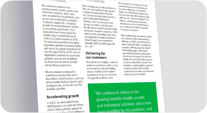 baseline of 54% in 2017. We will improved our NPS from +1 in 2017, significant growth opportunities in continue to drive this momentum to +20 in 2022, and improved our the region. In Global Wealth and Asset Management (Global WAM), we are a through our growing agency straight-through-processing (STP) global leader in retirement, a top 10 force, successful bancassurance rate from 68% in 2018 to 83% in partnerships, transformational digital 2022. We have also invested almost global retail multi-manager, and one offerings, and strategic expansion into $1 billion to enhance our digital of the largest natural resource asset managers for institutional investors high growth markets in the Asia region capabilities since 2018. globally. We are a leading life insurer where, by 2025, we aim to generate 50% of our core earnings. We’re proud of our leading suite and in Canada, and we are a global leader in behavioural insurance. continued expansion of behavioural We’re bringing our growth ambitions to insurance offerings. In the United We continue to believe in the life in the most attractive high growth States, we achieved our highest ever markets through partnerships like full year domestic life insurance sales growing need for health, wealth, and our 16-year exclusive bancassurance with the John Hancock Vitality PLUS retirement solutions, which have been amplified by the pandemic, and partnership with VietinBank in feature, reflecting the increasing we are well positioned to capitalize Vietnam, which has already shown attractiveness of the Vitality feature strong momentum in its first year. as an option for health-focused life on global megatrends. The global We also became the first global wealth insurance consumers. growth of household wealth remains a compelling opportunity. This is and asset manager to acquire a 100% We’re continuing to innovate to provide especially true in Asia, where the stake in a fully operating public fund our customers with unique wellness management company in mainland middle class is expected to grow offerings. In 2022, we entered into a China through our investment in 75% to 3.5 billion people by 2030. partnership with GRAIL, a healthcare The size and proportion of an aging Manulife TEDA Fund Management ® population globally is growing rapidly Co., Ltd. company, offering access to Galleri , with one in six people expected to be their leading edge, multi-cancer over the age of 60 by 2030. And, as Delivering for early detection test to a pilot group digitization continues to accelerate our customers of customers through John Hancock globally, success will be defined Vitality. We are the first life insurance by those who are able to provide carrier to make GRAIL’s Galleri® We want to be the digital, customer test extraordinary experiences. leader in our industry, which is why available, enabling eligible customers we remain focused on providing to take proactive steps to better We are uniquely positioned to simple, intuitive and innovative understand and make more informed meet these opportunities with a experiences across our business. choices about their health. diversified, scaled business, and have Through those efforts, we’ve demonstrated that we have the right strategy to win, anchored in our five strategic priorities. Accelerating growth “W e continue to believe in the In 2022, our diversified Global growing need for health, wealth, WAM business recorded net inflows and retirement solutions, which have of $3.3 billion globally, against an industry backdrop of net outflows in been amplified by the pandemic, and North America. This performance extended our remarkable track we are well positioned to capitalize record of delivering positive net flows in 12 of the past 13 years. on global megatrends underpinning Our Global WAM and Asia results our strategy.” contributed to delivering 63% of our core earnings from our highest potential businesses against a 5
