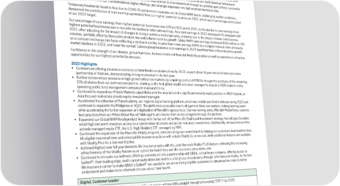 1 Baseline Targets 2022 2021 2017 2022 2025 Coreearningsfromhighestpotentialbusinesses 63% 63% 54% 67% 75% CoreearningsfromAsiaregion 39% 39% n/a n/a 50% In 2022, 63% of core earnings were generated from our highest potential businesses, a notable improvement of 9 percentage points from the 2017 baseline of 54%. This increase was supported by a strong execution track record against our strategic priorities, coupled with robust inorganic growth opportunities in Asia and Global WAM markets. Our position as the third largest Pan-Asian life insurer, a scalable Global WAM platform that enables an integrated operating model and distribution capabilities, and greater demand for our North American behavioural insurance products reinforced this growth. Looking forward, we will continue to drive momentum through our growing agency force, successful bancassurance partnerships, transformational digital offerings, and strategic expansion into high-potential markets in Asia. Temporary headwinds faced in Asia due to COVID-19 containment measures and in Global WAM due to challenging market conditions, dampened the contribution of core earnings generated from our highest potential business in 2022, which was 4 percentage points short of our 2022 target. Our percentage of core earnings from highest potential businesses was 63% in 2022 and in 2021, as the decline in core earnings from highest potential businesses was in line with the decline in total core earnings. Asia core earnings in 2022 decreased 2% compared with 2021, after adjusting for the impact of changes in foreign currency exchange rates, primarily due to the impact of lower new business volumes, partially offset by favourable product mix and in-force business growth. Global WAM core earnings decreased $165 million or 14% on a constant exchange rate basis reflecting a decline in net fee income from lower average AUMA due to higher interest rates and equity market declines in 2022, and lower fee spread. Canada group insurance core earnings in 2022 benefited from in-force business growth. Confidence in the strength of our diverse, global franchise, balance sheet and financial flexibility position us well to capitalize on attractive opportunities for our highest potential businesses. 2022Highlights • Commenced offering insurance solutions to VietinBank’s customers in early 2022, as part of our 16-year exclusive bancassurance partnership in Vietnam, demonstrating strong momentum in its first year; • Further bolstered our presence in high-growth attractive markets by acquiring control of MTEDA through the purchase of the remaining 51% of shares from our joint venture partner, making us the first global wealth and asset manager to acquire a 100% stake in a fully operating public fund management company in mainland China; • Continued to expand our Private Markets capabilities with the acquisition of a significant minority equity position in ARCH Capital, an Asia-focused real estate private equity investment manager; • Accelerated the utilization of ManuAcademy, our regional digital learning platform, which was initially launched in Vietnam during 2Q22 and continued to expand to the Philippines in 4Q22. The platform is accessible now to all agents in these two markets, making learning easier while accelerating the further expansion and digitization of Manulife’s agency force. Our new training series, Manulife MasterClass, captures best practices from our Million Dollar Round Table agents and shares them across all agents through the platform; • Expanded our Global WAM Retail product lineup with the launch of the Manulife Real Asset Investment strategy that will give Canadian retail high-net-worth investors access to a combination of private and public real asset investments. Additionally, we launched our first actively managed equity ETF, the U.S. High Dividend ETF, managed by MIM; • Continued the expansion of the Manulife Vitality program, demonstrating our commitment to helping our customers lead healthier lives. All eligible new retail term and universal life insurance policies will include Vitality Go at no cost, while additional features are available with Vitality Plus for a low monthly fee; • Achieved highest ever full year domestic life insurance sales with the John Hancock Vitality PLUS feature, reflecting the increasing attractiveness of the Vitality feature as an option for health-focused life insurance consumers; and • Continued to innovate our wellness offerings and entered into a partnership with GRAIL, a healthcare company, offering access to ® Galleri , their leading edge, multi-cancer early detection test to a pilot group of customers through John Hancock Vitality. As the first ® life insurance carrier to make GRAIL’s Galleri test available, we are enabling eligible customers to take proactive steps to better understand and make more informed choices about their health. Digital, Customer Leader 2 3 We remain committed to a target NPS of +37 and aim to achieve 88% straight-through-processing (“STP”) by 2025. Focus areas: • Harness customer feedback to enhance the experience delivered • Build differentiated, market-leading priority customer experiences • Extend customer relationships through value-added advice, new services in health and wellness, and open innovation • Drive NPS through a globally consistent NPS system 1 See “Caution regarding forward-looking statements” above. 2 Represents an improvement of +36 points in our NPS score from the 2017 baseline. 3 Straight-through processing represents customer interactions that are completely digital, and includes money movement. 18 | 2022AnnualReport | Management’sDiscussionandAnalysis
