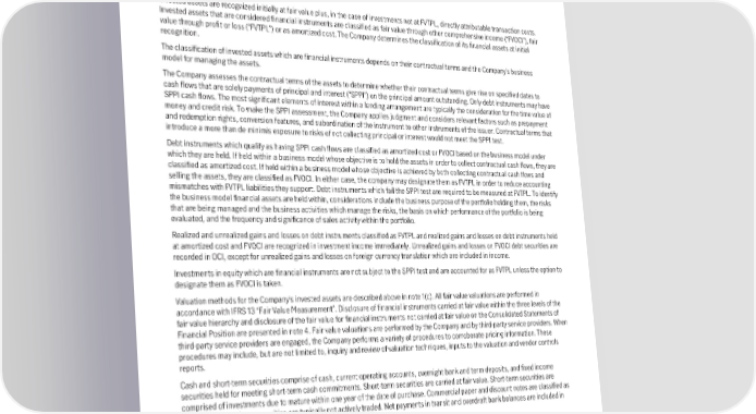 Note 25 Significant accounting policies in accordance with IFRS 9 and IFRS 17 As discussed in note 2 “Accounting and Reporting Changes”, the Company adopted IFRS 9 (“Financial Instruments”) and IFRS 17 (“Insurance Contracts”) as a replacement of IAS 39 and IFRS 4 effective January 1, 2023. The Consolidated Financial Statements starting from January 1, 2023, and any required comparatives, will be prepared in accordance with the new standards. This note outlines the Company’s accounting policies on invested assets, derivatives and hedging instruments that are in accordance with IFRS 9, as well as the accounting policies on insurance contract liabilities and reinsurance contract assets that are in accordance with IFRS 17. Refer to note 2 for adoption impacts of IFRS 9 and IFRS 17. Investedassets Invested assets are recognized initially at fair value plus, in the case of investments not at FVTPL, directly attributable transaction costs. Invested assets that are considered financial instruments are classified as fair value through other comprehensive income (“FVOCI”), fair value through profit or loss (“FVTPL”) or as amortized cost. The Company determines the classification of its financial assets at initial recognition. The classification of invested assets which are financial instruments depends on their contractual terms and the Company’s business model for managing the assets. The Company assesses the contractual terms of the assets to determine whether their contractual terms give rise on specified dates to cash flows that are solely payments of principal and interest (“SPPI”) on the principal amount outstanding. Only debt instruments may have SPPI cash flows. The most significant elements of interest within a lending arrangement are typically the consideration for the time value of money and credit risk. To make the SPPI assessment, the Company applies judgment and considers relevant factors such as prepayment and redemption rights, conversion features, and subordination of the instrument to other instruments of the issuer. Contractual terms that introduce a more than de minimis exposure to risks of not collecting principal or interest would not meet the SPPI test. Debt instruments which qualify as having SPPI cash flows are classified as amortized cost or FVOCI based on the business model under which they are held. If held within a business model whose objective is to hold the assets in order to collect contractual cash flows, they are classified as amortized cost. If held within a business model whose objective is achieved by both collecting contractual cash flows and selling the assets, they are classified as FVOCI. In either case, the company may designate them as FVTPL in order to reduce accounting mismatches with FVTPL liabilities they support. Debt instruments which fail the SPPI test are required to be measured at FVTPL. To identify the business model financial assets are held within, considerations include the business purpose of the portfolio holding them, the risks that are being managed and the business activities which manage the risks, the basis on which performance of the portfolio is being evaluated, and the frequency and significance of sales activity within the portfolio. Realized and unrealized gains and losses on debt instruments classified as FVTPL and realized gains and losses on debt instruments held at amortized cost and FVOCI are recognized in investment income immediately. Unrealized gains and losses on FVOCI debt securities are recorded in OCI, except for unrealized gains and losses on foreign currency translation which are included in income. Investments in equity which are financial instruments are not subject to the SPPI test and are accounted for as FVTPL unless the option to designate them as FVOCI is taken. Valuation methods for the Company’s invested assets are described above in note 1(c). All fair value valuations are performed in accordance with IFRS 13 “Fair Value Measurement”. Disclosure of financial instruments carried at fair value within the three levels of the fair value hierarchy and disclosure of the fair value for financial instruments not carried at fair value on the Consolidated Statements of Financial Position are presented in note 4. Fair value valuations are performed by the Company and by third-party service providers. When third-party service providers are engaged, the Company performs a variety of procedures to corroborate pricing information. These procedures may include, but are not limited to, inquiry and review of valuation techniques, inputs to the valuation and vendor controls reports. Cash and short-term securities comprise of cash, current operating accounts, overnight bank and term deposits, and fixed income securities held for meeting short-term cash commitments. Short-term securities are carried at fair value. Short-term securities are comprised of investments due to mature within one year of the date of purchase. Commercial paper and discount notes are classified as Level 2 because these securities are typically not actively traded. Net payments in transit and overdraft bank balances are included in other liabilities. Debt securities are carried at fair value or amortized cost. Debt securities are generally valued by independent pricing vendors using proprietary pricing models incorporating current market inputs for similar instruments with comparable terms and credit quality (matrix pricing). The significant inputs include, but are not limited to, yield curves, credit risks and spreads, prepayment rates and volatility of these inputs. These debt securities are classified as Level 2 but can be Level 3 if significant inputs are market unobservable. Public equities are comprised of common and preferred equities and are carried at fair value. Public equities are generally classified as Level 1, as fair values are normally based on quoted market prices. Realized and unrealized gains and losse