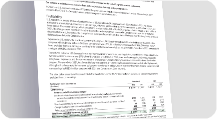 4. U.S. Our U.S. segment provides a range of life insurance products and insurance-based wealth accumulation products, and has an in-force long-term care insurance business and an in-force annuity business. The insurance products we offer are designed to provide estate, business and income-protection solutions for high net worth, emerging affluent markets and the middle market, and to leverage the asset management expertise and products managed by our Global Wealth and Asset Management business. Behavioural insurance features are standard on all our new insurance product offerings. The primary distribution channel is licensed financial advisors. We aim to establish lifelong customer relationships that benefit from our holistic protection and wealth product offerings in the future. Our in-force long-term care insurance policies provide coverage for the cost of long-term services and support. Our in-force annuity business includes fixed deferred, variable deferred, and payout products. In 2022, our U.S. segment contributed 27% of the Company’s core earnings from operating segments and, as at December 31, 2022, accounted for 17% of the Company’s assets under management and administration. Profitability U.S. reported net income attributed to shareholders of $3,950 million in 2022 compared with $2,080 million in 2021. Net income attributed to shareholders is comprised of core earnings, which was $1,700 million in 2022 compared with $1,936 million in 2021, and items excluded from core earnings, which amounted to a net gain of $2,250 million in 2022 compared with a net gain of $144 million in 2021. The changes in net income attributed to shareholders and core earnings expressed in Canadian dollars were due to the factors described below and, in addition, the change in core earnings reflected a $58 million favourable impact from the strengthening of the U.S. dollar compared with the Canadian dollar. Expressed in U.S. dollars, the functional currency of the segment, 2022 net income attributed to shareholders was US$3,077 million compared with US$1,667 million in 2021 and core earnings were US$1,311 million in 2022 compared with US$1,544 million in 2021. Items excluded from core earnings are outlined in the table below and amounted to a net gain of US$1,766 million in 2022 compared with a net gain of US$123 million in 2021. The US$233 million or 15% decrease in core earnings was driven by lower in-force earnings in Annuities of US$147 million related to the 1 of our U.S. variable annuity block in 2022, lower new business gains, higher net unfavourable two transactions to reinsure over 80% policyholder experience, and the non-recurrence of prior year gains from the Annuity Guaranteed Minimum Withdrawal Benefit offer program. Compared with 2021, less favourable long-term care and annuities policyholder experience was partially offset by improved, although still unfavourable, life insurance policyholder experience. In addition, higher investment income on allocated capital increased core earnings by US$24 million compared with 2021 (see Corporate and Other segment). The table below presents net income attributed to shareholders for the U.S. for 2022 and 2021 consisting of core earnings and items excluded from core earnings. For the years ended December 31, Canadian$ US$ ($ millions) 2022 2021 2022 2021 Coreearnings $ 1,700 $ 1,936 $ 1,311 $ 1,544 (1) Itemsexcludedfromcoreearnings: Investment-related experience related to fixed income trading, market value increases in excess of expected alternative assets investment returns, asset mix changes and credit experience 1,183 1,341 930 1,074 (2) Direct impact of equity markets and interest rates and variable annuity guarantee liabilities 197 (727) 151 (578) Change in actuarial methods and assumptions 36 (314) 27 (249) Reinsurance transactions, tax-related items and other 834 (156) 658 (124) Totalitemsexcludedfromcoreearnings 2,250 144 1,766 123 Netincome(loss)attributedtoshareholders $ 3,950 $ 2,080 $ 3,077 $ 1,667 (1) For explanations of items excluded from core earnings, see “Items excluded from core earnings” table in the total Company “Profitability” section above. (2) The direct impact of markets in 2022 was a gain of US$151 million and included a gain of US$396 million related to fixed income reinvestment rates, partially offset by a charge of US$245 million related to the direct impact of equity markets and variable annuity guarantee liabilities. The direct impact of markets in 2021 was a charge of US$578 million and included a charge of US$493 million related to fixed income reinvestment rates and a charge of US$85 million related to the direct impact of equity markets and variable annuity guarantee liabilities. Business Performance U.S. APE sales in 2022 of US$633 million increased 1% compared with 2021 due to an increase in international sales, partially offset by lower sales of domestic life insurance products. Demand for domestic life insurance products purchased primarily to protect household 1 Represents a reduction in guarantee value on our total U.S. variable annuity block compared with December 31, 2021. Guarantee value on our U.S. variable annuity Guaranteed Minimum Withdrawal Benefits block reduced by more than 90% compared with December 31, 2021. 29