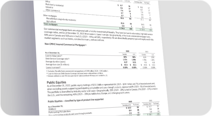 Mortgages As at December 31, 2022, our mortgage portfolio of $54.6 billion represented 13% of invested assets (2021 – $52.0 billion and 12%, respectively). Geographically, 66% of the portfolio is invested in Canada (2021 – 66%) and 34% is invested in the U.S. (2021 – 34%). The overall portfolio is also diversified by geographic region, property type, and borrower. Of the total mortgage portfolio, 13% is insured (2021 – 14%), primarily by the Canada Mortgage and Housing Corporation (“CMHC”) – Canada’s AAA rated government-backed national housing agency, with 31% of residential mortgages insured (2021 – 35%) and 1% of commercial mortgages insured (2021 – 2%). As at December 31, 2022 2021 ($ billions) Carrying value % of total Carrying value % of total Commercial Retail $ 8.7 16 $ 8.8 17 Office 9.1 17 8.7 17 Multi-family residential 7.4 13 7.0 13 Industrial 4.7 9 3.6 7 Other commercial 2.7 5 3.0 6 32.6 60 31.1 60 Other mortgages Manulife Bank single-family residential 21.6 39 20.5 39 Agricultural 0.4 1 0.4 1 Total mortgages $ 54.6 100 $ 52.0 100 Our commercial mortgage loans are originated with a hold-for-investment philosophy. They have low loan-to-value ratios, high debt-service coverage ratios, and as at December 31, 2022 there were no loans in arrears. Geographically, of the total commercial mortgage loans, 44% are in Canada and 56% are in the U.S. (2021 – 44% and 56%, respectively). We are diversified by property type and largely avoid risky market segments such as hotels, construction loans, and second liens. (1) Non-CMHC Insured Commercial Mortgages 2022 2021 As at December 31, Canada U.S. Canada U.S. (2) Loan-to-Value ratio 60% 56% 61% 57% (2) Debt-Service Coverage ratio 1.57x 1.90x 1.56x 1.87x Average duration (years) 4.27 6.31 4.6 6.8 Average loan size ($ millions) $ 21.5 $ 21.1 $ 19.4 $ 19.0 (3) Loans in arrears 0.00% 0.00% 0.00% 0.00% (1) Excludes Manulife Bank commercial mortgage loans of $381 million (2021 – $393 million). (2) Loan-to-Value and Debt-Service Coverage are based on re-underwritten cash flows. (3) Arrears defined as over 90 days past due in Canada and over 60 days past due in the U.S. Public Equities As at December 31, 2022, public equity holdings of $23.5 billion represented 6% (2021 – $28.1 billion and 7%) of invested assets and, when excluding assets supporting participating policyholder and pass-through products, represented 1% (2021 – 1%) of invested assets. The portfolio is diversified by industry sector and issuer. Geographically, 29% (2021 – 28%) is held in Canada; 31% (2021 – 37%) is held in the U.S.; and the remaining 40% (2021 – 35%) is held in Asia, Europe, and other geographic areas. Public Equities – classified by type of product-line supported As at December 31, 2022 2021 ($ billions) Carrying value % of total Carrying value % of total Participating Policyholders $12.2 52 $14.7 52 Non-participating products and pass-through products 8.4 36 9.6 34 Corporate and Other segment 2.9 12 3.8 14 (1) Total public equities $ 23.5 100 $ 28.1 100 (1) Includes $1.6 billion of AFS equities and $1.3 billion of seed money investments in new segregated and mutual funds. Alternative Long-Duration Assets (“ALDA”) Our ALDA portfolio is comprised of a diverse range of asset classes with varying degrees of correlations. The portfolio typically consists of private assets representing investments in varied sectors of the economy which act as a natural hedge against future inflation and serve as an alternative source of asset supply to long-term corporate bonds. In addition to being a suitable match for our long-duration liabilities, these assets provide enhanced long-term yields and diversification relative to traditional fixed income markets. The vast majority of our ALDA are managed in-house. 40 | 2022AnnualReport | Management’sDiscussionandAnalysis