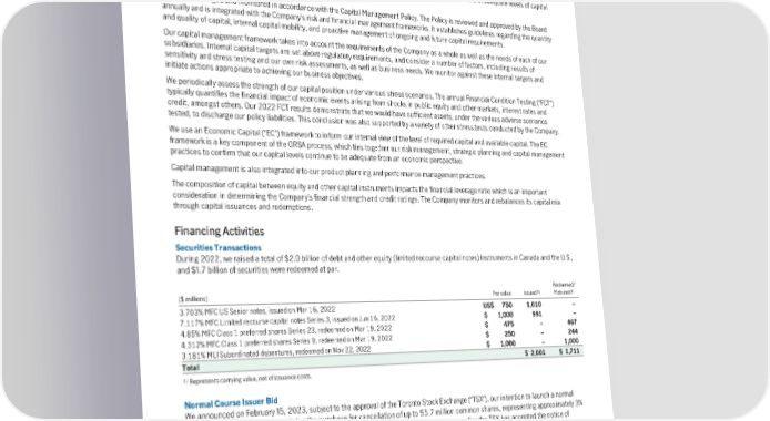10. Capital Management Framework Manulife seeks to manage its capital with the objectives of: • Operating with sufficient capital to be able to honour all commitments to its policyholders and creditors with a high degree of confidence; • Retaining the ongoing confidence of regulators, policyholders, rating agencies, investors and other creditors in order to ensure access to capital markets; and • Optimizing return on capital to meet shareholders’ expectations subject to constraints and considerations of adequate levels of capital established to meet the first two objectives. Capital is managed and monitored in accordance with the Capital Management Policy. The Policy is reviewed and approved by the Board annually and is integrated with the Company’s risk and financial management frameworks. It establishes guidelines regarding the quantity and quality of capital, internal capital mobility, and proactive management of ongoing and future capital requirements. Our capital management framework takes into account the requirements of the Company as a whole as well as the needs of each of our subsidiaries. Internal capital targets are set above regulatory requirements, and consider a number of factors, including results of sensitivity and stress testing and our own risk assessments, as well as business needs. We monitor against these internal targets and initiate actions appropriate to achieving our business objectives. We periodically assess the strength of our capital position under various stress scenarios. The annual Financial Condition Testing (“FCT”) typically quantifies the financial impact of economic events arising from shocks in public equity and other markets, interest rates and credit, amongst others. Our 2022 FCT results demonstrate that we would have sufficient assets, under the various adverse scenarios tested, to discharge our policy liabilities. This conclusion was also supported by a variety of other stress tests conducted by the Company. We use an Economic Capital (“EC”) framework to inform our internal view of the level of required capital and available capital. The EC framework is a key component of the ORSA process, which ties together our risk management, strategic planning and capital management practices to confirm that our capital levels continue to be adequate from an economic perspective. Capital management is also integrated into our product planning and performance management practices. The composition of capital between equity and other capital instruments impacts the financial leverage ratio which is an important consideration in determining the Company’s financial strength and credit ratings. The Company monitors and rebalances its capital mix through capital issuances and redemptions. Financing Activities SecuritiesTransactions During 2022, we raised a total of $2.0 billion of debt and other equity (limited recourse capital notes) instruments in Canada and the U.S., and $1.7 billion of securities were redeemed at par. Redeemed/ (1) (1) ($ millions) Par value Issued Matured 3.703% MFC US Senior notes, issued on Mar 16, 2022 US$ 750 1,010 – 7.117% MFC Limited recourse capital notes Series 3, issued on Jun 16, 2022 $ 1,000 991 – 4.85% MFC Class 1 preferred shares Series 23, redeemed on Mar 19, 2022 $ 475 – 467 4.312% MFC Class 1 preferred shares Series 9, redeemed on Mar 19, 2022 $ 250 – 244 3.181% MLI Subordinated debentures, redeemed on Nov 22, 2022 $ 1,000 – 1,000 Total $ 2,001 $ 1,711 (1) Represents carrying value, net of issuance costs. NormalCourseIssuerBid We announced on February 15, 2023, subject to the approval of the Toronto Stock Exchange (“TSX”), our intention to launch a normal course issuer bid (“NCIB”) permitting the purchase for cancellation of up to 55.7 million common shares, representing approximately 3% of our issued and outstanding common shares. Purchases under the NCIB may commence after the TSX has accepted the notice of 1 intention and continue for up to one year, or such earlier date as we complete our purchases. Our previous NCIB that was announced on February 1, 2022 expired on February 2, 2023. Under this NCIB, MFC purchased for cancellation 85.8 million of its common shares at an average price of $23.99 per share for a total cost of $2.1 billion, which represent 4.4% of our issued and outstanding common shares. During 2022, MFC purchased and subsequently cancelled 78.9 million of its common shares at an average price of $23.87 per common share for a total cost of $1.9 billion. 1 See “Caution regarding forward-looking statements” above. 85