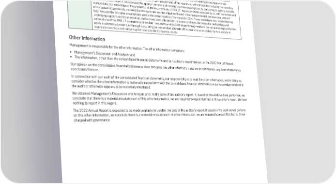 IFRS 17 Insurance Contracts Adoption Disclosure HowOurAudit We obtained an understanding, evaluated the design, and tested the operating effectiveness of management’s controls over the Addressedthe disclosure of the effects of applying the new standard to insurance contract liabilities including the transition CSM. The controls we KeyAudit tested included, among others, controls related to management’s selection of accounting policies and the related determination of Matter the transition approach, as well as controls related to the development of fair value and actuarial models, the integrity of data used, implementation of new systems and models, and assumption setting and implementation processes. To test the Company’s disclosure of the impact of IFRS 17 on the insurance contract liabilities including the transition CSM, our audit procedures included, among others, involving our actuarial specialists to evaluate the related accounting policies, the elections involved in transition, and to assess the appropriateness of the determination of where the Full Retrospective Approach was impracticable. In relation to the assumptions used in the measurement of the insurance contract liabilities including the transition CSM, disclosed in Note 2, we assessed the appropriateness and consistency of key assumptions by comparing to publicly available market data, our knowledge of the products and the requirements of IFRS 17. Key assumptions assessed by us, with the involvement of our actuarial specialists, included the discount rate and risk adjustment used in the measurement of the insurance contract liabilities and the fair value assumptions used in the determination of the transition CSM. These procedures also included testing underlying support and documentation, such as executed policyholder insurance contracts. We tested the methodology and calculations of the IFRS 17 insurance contract liabilities and transition CSM either through review of the calculation logic within the newly implemented models, or through calculating an independent estimate of the insurance contract liability for a sample of insurance contracts and comparing the results to the Company’s results. Other Information Management is responsible for the other information. The other information comprises: • Management’s Discussion and Analysis; and • The information, other than the consolidated financial statements and our auditor’s report thereon, in the 2022 Annual Report. Our opinion on the consolidated financial statements does not cover the other information and we do not express any form of assurance conclusion thereon. In connection with our audit of the consolidated financial statements, our responsibility is to read the other information, and in doing so, consider whether the other information is materially inconsistent with the consolidated financial statements or our knowledge obtained in the audit or otherwise appears to be materially misstated. We obtained Management’s Discussion and Analysis prior to the date of this auditor’s report. If, based on the work we have performed, we conclude that there is a material misstatement of this other information, we are required to report that fact in this auditor’s report. We have nothing to report in this regard. The 2022 Annual Report is expected to be made available to us after the date of the auditor’s report. If based on the work we will perform on this other information, we conclude there is a material misstatement of other information, we are required to report that fact to those charged with governance. 134 | 2022AnnualReport | ConsolidatedFinancialStatements