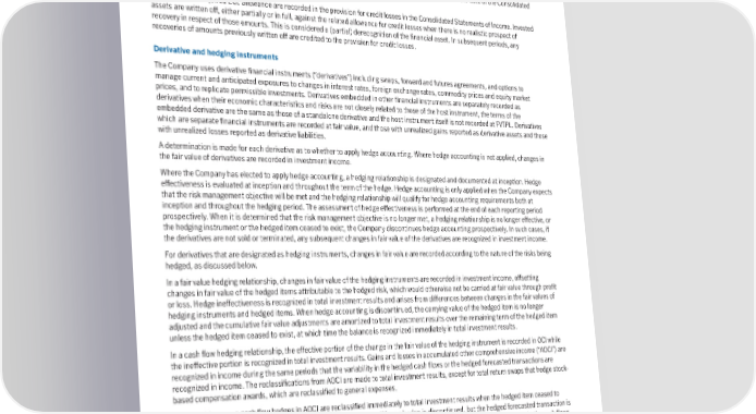 When estimating ECLs, the four probability-weighted macroeconomic scenarios are considered. Economic forward-looking inputs include stock price indices (“SPI”), unemployment rates (“UEs”), oil prices and the 7-10 year BBB US Corporate Index. Application of each input varies by product. Depending on their usage in the models, macroeconomic inputs are projected at the country, province, or more granular level. Each macroeconomic scenario used includes a projection of all relevant macroeconomic variables for a five-year period, subsequently reverting to long-run averages. In order to achieve an unbiased estimate, economic data used in the models is supplied by an external source. This information is compared to other publicly available forecasts, and the scenarios are assigned a probability weighting based on statistical analysis and management judgment. The inputs and models used for calculating ECLs may not always capture all characteristics of the market at the date of the Consolidated Financial Statements. Changes in the required ECL allowance are recorded in the provision for credit losses in the Consolidated Statements of Income. Invested assets are written off, either partially or in full, against the related allowance for credit losses when there is no realistic prospect of recovery in respect of those amounts. This is considered a (partial) derecognition of the financial asset. In subsequent periods, any recoveries of amounts previously written off are credited to the provision for credit losses. Derivativeandhedginginstruments The Company uses derivative financial instruments (“derivatives”) including swaps, forward and futures agreements, and options to manage current and anticipated exposures to changes in interest rates, foreign exchange rates, commodity prices and equity market prices, and to replicate permissible investments. Derivatives embedded in other financial instruments are separately recorded as derivatives when their economic characteristics and risks are not closely related to those of the host instrument, the terms of the embedded derivative are the same as those of a standalone derivative and the host instrument itself is not recorded at FVTPL. Derivatives which are separate financial instruments are recorded at fair value, and those with unrealized gains reported as derivative assets and those with unrealized losses reported as derivative liabilities. A determination is made for each derivative as to whether to apply hedge accounting. Where hedge accounting is not applied, changes in the fair value of derivatives are recorded in investment income. Where the Company has elected to apply hedge accounting, a hedging relationship is designated and documented at inception. Hedge effectiveness is evaluated at inception and throughout the term of the hedge. Hedge accounting is only applied when the Company expects that the risk management objective will be met and the hedging relationship will qualify for hedge accounting requirements both at inception and throughout the hedging period. The assessment of hedge effectiveness is performed at the end of each reporting period prospectively. When it is determined that the risk management objective is no longer met, a hedging relationship is no longer effective, or the hedging instrument or the hedged item ceased to exist, the Company discontinues hedge accounting prospectively. In such cases, if the derivatives are not sold or terminated, any subsequent changes in fair value of the derivatives are recognized in investment income. For derivatives that are designated as hedging instruments, changes in fair value are recorded according to the nature of the risks being hedged, as discussed below. In a fair value hedging relationship, changes in fair value of the hedging instruments are recorded in investment income, offsetting changes in fair value of the hedged items attributable to the hedged risk, which would otherwise not be carried at fair value through profit or loss. Hedge ineffectiveness is recognized in total investment results and arises from differences between changes in the fair values of hedging instruments and hedged items. When hedge accounting is discontinued, the carrying value of the hedged item is no longer adjusted and the cumulative fair value adjustments are amortized to total investment results over the remaining term of the hedged item unless the hedged item ceased to exist, at which time the balance is recognized immediately in total investment results. In a cash flow hedging relationship, the effective portion of the change in the fair value of the hedging instrument is recorded in OCI while the ineffective portion is recognized in total investment results. Gains and losses in accumulated other comprehensive income (“AOCI”) are recognized in income during the same periods that the variability in the hedged cash flows or the hedged forecasted transactions are recognized in income. The reclassifications from AOCI are made to total investment results, except for total return swaps that hedge stock- based compensation awards, which are reclassified to general expenses. Gains and losses on cash flow hedges in AOCI are reclassified immediately to total investment results when the hedged item ceased to exist or the forecasted transaction is no longer expected to occur. When a hedge is discontinued, but the hedged forecasted transaction is expected to occur, the amounts in AOCI are reclassified to total investment results in the periods during which variability in the cash flows hedged or the hedged forecasted transaction is recognized in income. In a net investment in foreign operations hedging relationship, gains and losses relating to the effective portion of the hedge are recorded in OCI. Gains and losses in AOCI are recognized in income during the periods when gains or losses on the underlying hedged net investment in foreign operations are recognized in income upon disposal of the foreign