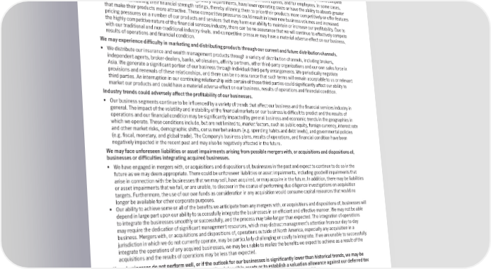 owners of policies and contracts we have issued; impact our ability to obtain reinsurance at reasonable prices or at all; and materially increase the number of withdrawals by policyholders of cash values from their policies; and reduce new sales. Competitive factors may adversely affect our market share and profitability. • The insurance, wealth and asset management industries are highly competitive. Our competitors include other insurers, securities firms, investment advisors, mutual funds, banks and other financial institutions. The rapid advancement of new technologies, such as blockchain, artificial intelligence and advanced analytics, may enable other non-traditional firms to compete directly in the industry space, or offer services to our traditional competitors to enhance their value propositions. The impact from technological disruption may result in our competitors improving their customer experience, product offerings and business costs. Our competitors compete with us for customers, access to distribution channels such as brokers and independent agents, and for employees. In some cases, competitors may be subject to less onerous regulatory requirements, have lower operating costs or have the ability to absorb greater risk while maintaining their financial strength ratings, thereby allowing them to price their products more competitively or offer features that make their products more attractive. These competitive pressures could result in lower new business volumes and increased pricing pressures on a number of our products and services that may harm our ability to maintain or increase our profitability. Due to the highly competitive nature of the financial services industry, there can be no assurance that we will continue to effectively compete with our traditional and non-traditional industry rivals, and competitive pressure may have a material adverse effect on our business, results of operations and financial condition. We may experience difficulty in marketing and distributing products through our current and future distribution channels. • We distribute our insurance and wealth management products through a variety of distribution channels, including brokers, independent agents, broker-dealers, banks, wholesalers, affinity partners, other third-party organizations and our own sales force in Asia. We generate a significant portion of our business through individual third-party arrangements. We periodically negotiate provisions and renewals of these relationships, and there can be no assurance that such terms will remain acceptable to us or relevant third parties. An interruption in our continuing relationship with certain of these third parties could significantly affect our ability to market our products and could have a material adverse effect on our business, results of operations and financial condition. Industry trends could adversely affect the profitability of our businesses. • Our business segments continue to be influenced by a variety of trends that affect our business and the financial services industry in general. The impact of the volatility and instability of the financial markets on our business is difficult to predict and the results of operations and our financial condition may be significantly impacted by general business and economic trends in the geographies in which we operate. These conditions include, but are not limited to, market factors, such as public equity, foreign currency, interest rate and other market risks, demographic shifts, consumer behaviours (e.g. spending habits and debt levels), and governmental policies (e.g. fiscal, monetary, and global trade). The Company’s business plans, results of operations, and financial condition have been negatively impacted in the recent past and may also be negatively affected in the future. We may face unforeseen liabilities or asset impairments arising from possible mergers with, or acquisitions and dispositions of, businesses or difficulties integrating acquired businesses. • We have engaged in mergers with, or acquisitions and dispositions of, businesses in the past and expect to continue to do so in the future as we may deem appropriate. There could be unforeseen liabilities or asset impairments, including goodwill impairments that arise in connection with the businesses that we may sell, have acquired, or may acquire in the future. In addition, there may be liabilities or asset impairments that we fail, or are unable, to discover in the course of performing due diligence investigations on acquisition targets. Furthermore, the use of our own funds as consideration in any acquisition would consume capital resources that would no longer be available for other corporate purposes. • Our ability to achieve some or all of the benefits we anticipate from any mergers with, or acquisitions and dispositions of, businesses will depend in large part upon our ability to successfully integrate the businesses in an efficient and effective manner. We may not be able to integrate the businesses smoothly or successfully, and the process may take longer than expected. The integration of operations may require the dedication of significant management resources, which may distract management’s attention from our day-to-day business. Mergers with, or acquisitions and dispositions of, operations outside of North America, especially any acquisition in a jurisdiction in which we do not currently operate, may be particularly challenging or costly to integrate. If we are unable to successfully integrate the operations of any acquired businesses, we may be unable to realize the benefits we expect to achieve as a result of the acquisitions and the results of operations may be less than expected. If our businesses do not perform well, or if the outlook for our businesses is significantly lower than historical trends, we may be required to recognize an impairment of goodwill or intangible assets or to establish a v
