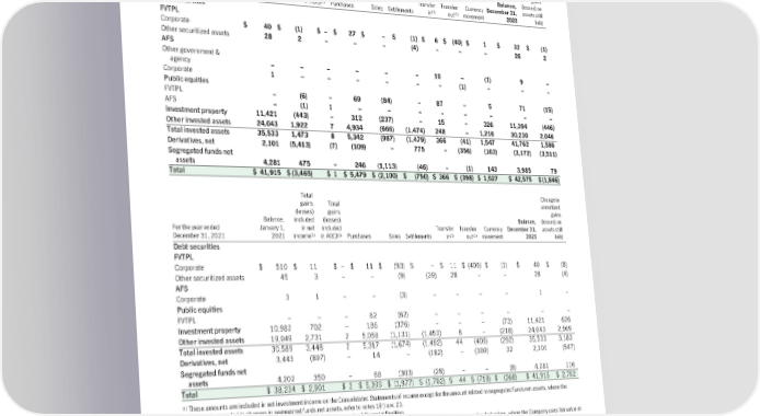 assumptions in determining Level 3 fair values. The gains and losses in the table below includes the changes in fair value due to both observable and unobservable factors. The following table presents a roll forward for invested assets, net derivatives and segregated funds net assets measured at fair value using significant unobservable inputs (Level 3) for the years ended December 31, 2022 and 2021. Total Change in gains Total unrealized (losses) gains gains Balance, included (losses) Balance, (losses) on For the year ended January 1, in net included Transfer Transfer Currency December31, assets still (1) (2) (3) (3) December 31, 2022 2022 income in AOCI Purchases Sales Settlements in out movement 2022 held Debt securities FVTPL Corporate $ 40 $ (1) $ – $ 27 $ – $ (1) $ 6 $ (40) $ 1 $ 32 $ (1) Other securitized assets 28 2 – – – (4) – – – 26 2 AFS Other government & agency ––––––10–(1)9– Corporate 1––––––(1)––– Public equities FVTPL – (6) – 69 (84) – 87 – 5 71 (15) AFS –(1)1–––––– –– Investment property 11,421 (443) – 312 (237) – 15 – 326 11,394 (446) Other invested assets 24,043 1,922 7 4,934 (666) (1,474) 248 – 1,216 30,230 2,046 Total invested assets 35,533 1,473 8 5,342 (987) (1,479) 366 (41) 1,547 41,762 1,586 Derivatives, net 2,101 (5,413) (7) (109) – 775 – (356) (163) (3,172) (3,511) Segregated funds net assets 4,281 475 – 246 (1,113) (46) – (1) 143 3,985 79 Total $ 41,915 $(3,465) $ 1 $ 5,479 $ (2,100) $ (750) $ 366 $ (398) $ 1,527 $ 42,575 $(1,846) Total Change in gains Total unrealized (losses) gains gains Balance, included (losses) Balance, (losses) on For the year ended January 1, in net included Transfer Transfer Currency December 31, assets still (1) (2) (3) (3) December 31, 2021 2021 income in AOCI Purchases Sales Settlements in out movement 2021 held Debt securities FVTPL Corporate $ 510 $ 11 $ – $ 11 $ (93) $ – $ 11 $ (409) $ (1) $ 40 $ (8) Other securitized assets 45 3 – – (9) (39) 28 – – 28 (4) AFS Corporate 3 1 – – (3) – – – – 1 – Public equities FVTPL – – – 62 (62) – – – – – – Investment property 10,982 702 – 186 (376) – – – (73) 11,421 626 Other invested assets 19,049 2,731 2 5,058 (1,131) (1,453) 5 – (218) 24,043 2,569 Total invested assets 30,589 3,448 2 5,317 (1,674) (1,492) 44 (409) (292) 35,533 3,183 Derivatives, net 3,443 (897) – 14 – (182) – (309) 32 2,101 (547) Segregated funds net assets 4,202 350 – 68 (303) (28) – – (8) 4,281 116 Total $ 38,234 $ 2,901 $ 2 $ 5,399 $ (1,977) $ (1,702) $ 44 $ (718) $ (268) $ 41,915 $ 2,752 (1) These amounts are included in net investment income on the Consolidated Statements of Income except for the amount related to segregated funds net assets, where the amount is recorded in changes in segregated funds net assets, refer to notes 1(h) and 23. (2) These amounts are included in AOCI on the Consolidated Statements of Financial Position. (3) The Company uses fair values of the assets at the beginning of the year for assets transferred into and out of Level 3 except for derivatives, where the Company uses fair value at the end of the year and at the beginning of the year, respectively. Transfers into Level 3 primarily result from securities that were impaired during the year or securities where a lack of observable market data (versus the previous period) resulted in reclassifying assets into Level 3. Transfers from Level 3 primarily result from observable market data becoming available for the entire term structure of the debt security. 167