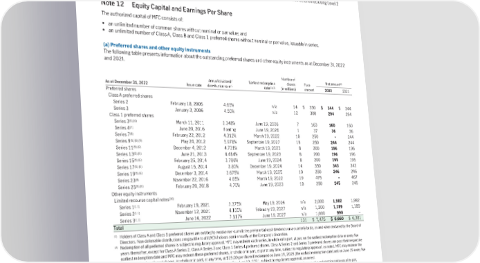 (b) Fair valuemeasurement Fair value of capital instruments is determined using the following hierarchy: Level 1 – Fair value is determined using quoted market prices where available. Level 2 – When quoted market prices are not available, fair value is determined with reference to quoted prices of similar debt instruments or estimated using discounted cash flows based on observable market rates. The Company measures capital instruments at amortized cost in the Consolidated Statements of Financial Position. As at December 31, 2022, the fair value of capital instruments was $5,737 (2021 – $7,213). Fair value of capital instruments was determined using Level 2 valuation techniques (2021 – Level 2). Note 12 Equity Capital and Earnings Per Share The authorized capital of MFC consists of: • an unlimited number of common shares without nominal or par value; and • an unlimited number of Class A, Class B and Class 1 preferred shares without nominal or par value, issuable in series. (a) Preferredsharesandotherequityinstruments The following table presents information about the outstanding preferred shares and other equity instruments as at December 31, 2022 and 2021. Number of (4) Annual dividend/ Earliest redemption shares Face Net amount (1) (2),(3) As at December 31, 2022 Issue date distribution rate date (in millions) amount 2022 2021 Preferred shares Class A preferred shares Series 2 February 18, 2005 4.65% n/a 14 $ 350 $ 344 $ 344 Series 3 January 3, 2006 4.50% n/a 12 300 294 294 Class 1 preferred shares (5),(6) Series 3 March 11, 2011 2.348% June 19, 2026 7 163 160 160 (7) Series 4 June 20, 2016 floating June 19, 2026 1 37 36 36 (8) Series 7 February 22, 2012 4.312% March 19, 2022 10 250 – 244 (5),(6),(9) Series 9 May 24, 2012 5.978% September 19, 2027 10 250 244 244 (5),(6) Series 11 December 4, 2012 4.731% March 19, 2023 8 200 196 196 (5),(6) Series 13 June 21, 2013 4.414% September 19, 2023 8 200 196 196 (5),(6) Series 15 February 25, 2014 3.786% June 19, 2024 8 200 195 195 (5),(6) Series 17 August 15, 2014 3.80% December 19, 2024 14 350 343 343 (5),(6) Series 19 December 3, 2014 3.675% March 19, 2025 10 250 246 246 (8) Series 23 November 22, 2016 4.85% March 19, 2022 19 475 – 467 (5),(6) Series 25 February 20, 2018 4.70% June 19, 2023 10 250 245 245 Other equity instruments (10) Limited recourse capital notes (11) Series 1 February 19, 2021 3.375% May 19, 2026 n/a 2,000 1,982 1,982 (11) Series 2 November 12, 2021 4.100% February 19, 2027 n/a 1,200 1,189 1,189 (11) Series 3 June 16, 2022 7.117% June 19, 2027 n/a 1,000 990 – Total 131 $ 7,475 $ 6,660 $ 6,381 (1) Holders of Class A and Class 1 preferred shares are entitled to receive non-cumulative preferential cash dividends on a quarterly basis, as and when declared by the Board of Directors. Non-deferrable distributions are payable to all LRCN holders semi-annually at the Company’s discretion. (2) Redemption of all preferred shares is subject to regulatory approval. MFC may redeem each series, in whole or in part, at par, on the earliest redemption date or every five years thereafter, except for Class A Series 2, Class A Series 3 and Class 1 Series 4 preferred shares. Class A Series 2 and Series 3 preferred shares are past their respective earliest redemption date and MFC may redeem these preferred shares, in whole or in part, at par at any time, subject to regulatory approval, as noted. MFC may redeem the Class 1 Series 4 preferred shares, in whole or in part, at any time, at $25.00 per share if redeemed on June 19, 2026 (the earliest redemption date) and on June 19 every five years thereafter, or at $25.50 per share if redeemed on any other date after June 19, 2021, subject to regulatory approval, as noted. (3) Redemption of all LRCN series notes is subject to regulatory approval. MFC may at its option redeem each series in whole or in part, at a redemption price equal to par, together with accrued and unpaid interest. The redemption period for Series 1 is every five years during the period from May 19 to and including June 19, commencing in 2026. The redemption period for Series 2 is every five years during the period from February 19 to and including March 19, commencing in 2027. After the first redemption date, the redemption period for Series 3 is every five years during the period from May 19 to and including June 19, commencing in 2032. (4) Net of after-tax issuance costs. (5) On the earliest redemption date and every five years thereafter, the annual dividend rate will be reset to the five-year Government of Canada bond yield plus a yield specified for each series. The specified yield for Class 1 preferred shares is: Series 3 – 1.41%, Series 9 – 2.86%, Series 11 – 2.61%, Series 13 – 2.22%, Series 15 – 2.16%, Series 17 – 2.36%, Series 19 – 2.30% and Series 25 – 2.55%. (6) On the earliest redemption date and every five years thereafter, Class 1 preferred shares are convertible at the option of the holder into a new series that is one number higher than their existing series, and the holders are entitled to non-cumulative preferential cash dividends, payable quarterly if and when declared by the Board of Directors, at a rate equal to the three-month Government of Canada Treasury bill yield plus the rate specified in footnote 5 above. 195