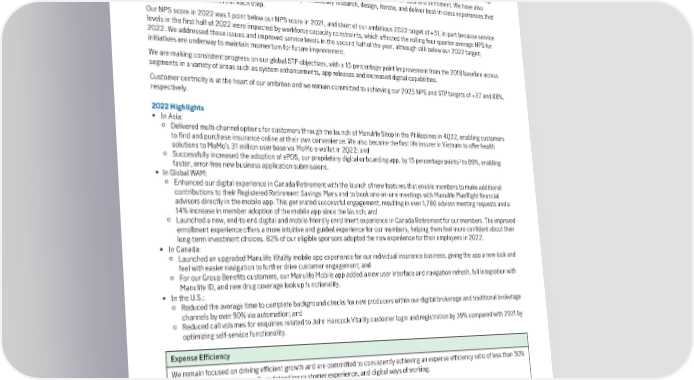 1 Baseline Targets 2022 2021 2018 2017 2022 2025 Netpromoterscore +20 +21 n/a +1 +31 +37 Straight-through-processing 83% 82% 68% n/a n/a 88% 2 In 2022, our NPS score was +20, and we led or were on par with leading peers in 11 of the 16 business lines where we benchmark. The score marked a significant 19 point improvement from our 2017 baseline, driven by various efforts. We have developed forward-looking roadmaps to align and propel our digital customer leadership ambition, refreshed our innovation strategy to embed new ways of working across our businesses, and are advancing our internal capabilities to gather and analyze customer data and sentiment. We have also globally deployed human-centered design practices to systematically research, design, iterate, and deliver best-in-class experiences that are validated with customers at each step. Our NPS score in 2022 was 1 point below our NPS score in 2021, and short of our ambitious 2022 target of +31, in part because service levels in the first half of 2022 were impacted by workforce capacity constraints, which affected the rolling four quarter average NPS for 2022. We addressed these issues and improved service levels in the second half of the year, although still below our 2022 target; initiatives are underway to maintain momentum for future improvement. We are making consistent progress on our global STP objectives, with a 15 percentage point improvement from the 2018 baseline across segments in a variety of areas such as system enhancements, app releases and increased digital capabilities. Customer centricity is at the heart of our ambition and we remain committed to achieving our 2025 NPS and STP targets of +37 and 88%, respectively. 2022Highlights • In Asia: O Delivered multi-channel options for customers through the launch of Manulife Shop in the Philippines in 4Q22, enabling customers to find and purchase insurance online at their own convenience. We also became the first life insurer in Vietnam to offer health solutions to MoMo’s 31 million user base via MoMo e-wallet in 2Q22; and O 3 Successfully increased the adoption of ePOS, our proprietary digital onboarding app, by 15 percentage points to 89%, enabling faster, error-free new business application submissions. • In Global WAM: O Enhanced our digital experience in Canada Retirement with the launch of new features that enable members to make additional contributions to their Registered Retirement Savings Plans and to book one-on-one meetings with Manulife PlanRight financial advisors directly in the mobile app. This generated successful engagement, resulting in over 1,780 advisor meeting requests and a 14% increase in member adoption of the mobile app since the launch; and O Launched a new, end-to-end digital and mobile-friendly enrollment experience in Canada Retirement for our members. The improved enrollment experience offers a more intuitive and guided experience for our members, helping them feel more confident about their long-term investment choices. 82% of our eligible sponsors adopted the new experience for their employees in 2022. • In Canada: O Launched an upgraded Manulife Vitalitymobile app experience for our individual insurance business, giving the app a new look and feel with easier navigation to further drive customer engagement; and O For our Group Benefits customers, our Manulife Mobile app added a new user interface and navigation refresh, full integration with Manulife ID, and new drug coverage look up functionality. • In the U.S.: O Reduced the average time to complete background checks for new producers within our digital brokerage and traditional brokerage channels by over 90% via automation; and O Reduced call volumes for enquiries related to John Hancock Vitality customer login and registration by 39% compared with 2021 by optimizing self-service functionality. Expense Efficiency We remain focused on driving efficient growth and are committed to consistently achieving an expense efficiency ratio of less than 50% while ensuring scalable growth, outstanding customer experience, and digital ways of working. Focus areas: • Leverage global scale and operating environment • Streamline business processes and eliminate activities not valued by end customers • Continue to sustain a culture of expense efficiency and driving efficient growth 1 See “Caution regarding forward-looking statements” above. 2 Based on studies conducted in 2022 by IPSOS, a global market research company. 3 Case adoption, compared with 2021. 19
