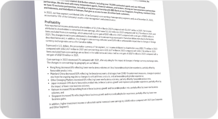 2. Asia Our Asia segment is a leading provider of insurance products and insurance-based wealth accumulation products, driven by a customer-centric strategy, leveraging the asset management expertise and products managed by our Global Wealth and Asset Management segment. Present in many of Asia’s largest and fastest growing economies, we are well positioned to capitalize on the attractive underlying demographics of the region, underpinned by a rigorous focus on creating value for our customers, employees and shareholders. We have insurance operations in 11 markets: Hong Kong, Macau, Japan, mainland China, Singapore, Vietnam, Indonesia, the Philippines, Malaysia, Cambodia, and Myanmar. We have a diversified multi-channel distribution network, including over 116,000 contracted agents and over 100 bank partnerships. We also work with many independent agents, financial advisors, and brokers. Among our bancassurance partnerships we have 10 exclusive partnerships, including a long-term partnership with DBS Bank across Singapore, Hong Kong, mainland China and Indonesia, and VietinBank in Vietnam, that give us access to over 35 million bank customers. In 2022, our Asia segment contributed 33%1 of the Company’s core earnings from operating segments and, as at December 31, 2022, 1 of the Company’s assets under management and administration. accounted for 11% Profitability Asia reported net income attributed to shareholders of $2,224 million in 2022 compared with $3,057 million in 2021. Net income attributed to shareholders is comprised of core earnings, which were $2,132 million in 2022 compared with $2,176 million in 2021, and items excluded from core earnings, which amounted to a net gain of $92 million for 2022 compared with a net gain of $881 million in 2021. The changes in net income attributed to shareholders and core earnings expressed in Canadian dollars were due to the factors described below and, in addition, the change in core earnings reflected a net $28 million unfavourable impact due to changes in foreign currency exchange rates versus the Canadian dollar. Expressed in U.S. dollars, the presentation currency of the segment, net income attributed to shareholders was US$1,711 million in 2022 compared with US$2,437 million in 2021 and core earnings were US$1,637 million in 2022 compared with US$1,736 million in 2021. Items excluded from core earnings are outlined in the table below and amounted to a net gain of US$74 million in 2022 compared with a net gain of US$701 million in 2021. Core earnings in 2022 decreased 2% compared with 2021, after adjusting for the impact of changes in foreign currency exchange rates. The changes in core earnings by geography are as follows: • Hong Kong decreased 8% reflecting lower new business volumes and less favourable policyholder experience, partially offset by favourable product mix; • Mainland China decreased 83% reflecting the broader economic challenges from COVID-19 containment measures, changes in product mix from the ongoing regulatory changes to critical illness products, and unfavourable policyholder experience; • Other Emerging Markets decreased 6% reflecting lower new business volumes, partially offset by favourable product mix; • Japan increased 24% due to favourable product mix, in-force business growth and improved policyholder experience, partially offset by the impact of lower new business volumes; • Vietnam increased 9% benefiting from in-force business growth and favourable product mix, partially offset by lower new business volumes; and • Singapore increased 1% reflecting in-force business growth and improved policyholder experience, partially offset by lower new business gains. In addition, higher investment income on allocated capital increased core earnings by US$49 million compared with 2021 (see Corporate and Other Segment). 1 This item is a non-GAAP ratio. See “Non-GAAP and Other Financial Measures” below for more information. 22 | 2022AnnualReport | Management’sDiscussionandAnalysis