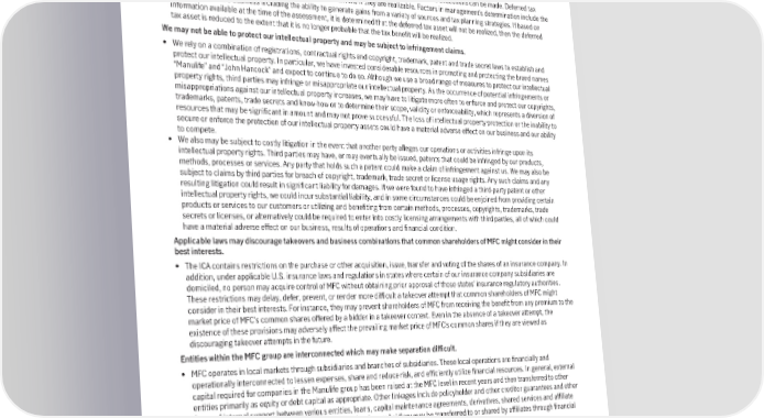 • If market conditions deteriorate in the future and, in particular, if MFC’s common share price is low relative to book value per share, if the Company’s actions to limit risk associated with its products or investments cause a significant change in any one CGU’s recoverable amount, or if the outlook for a CGU’s results deteriorate, the Company may need to reassess the value of goodwill and/or intangible assets which could result in impairments during 2023 or subsequent periods. Such impairments could have a material adverse effect on our results of operations and financial condition. • Deferred income tax balances represent the expected future tax effects of the differences between the book and tax basis of assets and liabilities, loss carry forwards and tax credits. Deferred tax assets are recorded when the Company expects to claim deductions on tax returns in the future for expenses that have already been recorded in the financial statements. • The availability of those deductions is dependent on future taxable income against which the deductions can be made. Deferred tax assets are assessed periodically by management to determine if they are realizable. Factors in management’s determination include the performance of the business including the ability to generate gains from a variety of sources and tax planning strategies. If based on information available at the time of the assessment, it is determined that the deferred tax asset will not be realized, then the deferred tax asset is reduced to the extent that it is no longer probable that the tax benefit will be realized. We may not be able to protect our intellectual property and may be subject to infringement claims. • We rely on a combination of registrations, contractual rights and copyright, trademark, patent and trade secret laws to establish and protect our intellectual property. In particular, we have invested considerable resources in promoting and protecting the brand names “Manulife” and “John Hancock” and expect to continue to do so. Although we use a broad range of measures to protect our intellectual property rights, third parties may infringe or misappropriate our intellectual property. As the occurrence of potential infringements or misappropriations against our intellectual property increases, we may have to litigate more often to enforce and protect our copyrights, trademarks, patents, trade secrets and know-how or to determine their scope, validity or enforceability, which represents a diversion of resources that may be significant in amount and may not prove successful. The loss of intellectual property protection or the inability to secure or enforce the protection of our intellectual property assets could have a material adverse effect on our business and our ability to compete. • We also may be subject to costly litigation in the event that another party alleges our operations or activities infringe upon its intellectual property rights. Third parties may have, or may eventually be issued, patents that could be infringed by our products, methods, processes or services. Any party that holds such a patent could make a claim of infringement against us. We may also be subject to claims by third parties for breach of copyright, trademark, trade secret or license usage rights. Any such claims and any resulting litigation could result in significant liability for damages. If we were found to have infringed a third-party patent or other intellectual property rights, we could incur substantial liability, and in some circumstances could be enjoined from providing certain products or services to our customers or utilizing and benefiting from certain methods, processes, copyrights, trademarks, trade secrets or licenses, or alternatively could be required to enter into costly licensing arrangements with third parties, all of which could have a material adverse effect on our business, results of operations and financial condition. Applicable laws may discourage takeovers and business combinations that common shareholders of MFC might consider in their best interests. • The ICA contains restrictions on the purchase or other acquisition, issue, transfer and voting of the shares of an insurance company. In addition, under applicable U.S. insurance laws and regulations in states where certain of our insurance company subsidiaries are domiciled, no person may acquire control of MFC without obtaining prior approval of those states’ insurance regulatory authorities. These restrictions may delay, defer, prevent, or render more difficult a takeover attempt that common shareholders of MFC might consider in their best interests. For instance, they may prevent shareholders of MFC from receiving the benefit from any premium to the market price of MFC’s common shares offered by a bidder in a takeover context. Even in the absence of a takeover attempt, the existence of these provisions may adversely affect the prevailing market price of MFC’s common shares if they are viewed as discouraging takeover attempts in the future. Entities within the MFC group are interconnected which may make separation difficult. • MFC operates in local markets through subsidiaries and branches of subsidiaries. These local operations are financially and operationally interconnected to lessen expenses, share and reduce risk, and efficiently utilize financial resources. In general, external capital required for companies in the Manulife group has been raised at the MFC level in recent years and then transferred to other entities primarily as equity or debt capital as appropriate. Other linkages include policyholder and other creditor guarantees and other forms of internal support between various entities, loans, capital maintenance agreements, derivatives, shared services and affiliate reinsurance treaties. Accordingly, the risks undertaken by a subsidiary may be transferred to or shared by affiliates through financial and op