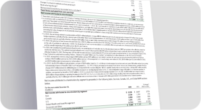 The table below presents 2022 and 2021 net income attributed to shareholders consisting of core earnings and items excluded from core earnings. For the years ended December 31, ($ millions) 2022 2021 Coreearnings $ 6,182 $ 6,536 Items excluded from core earnings:(1) (2) Investment-related experience outside of core earnings 817 1,642 Direct impact of equity markets and interest rates and variable annuity guarantee liabilities (840) (817) (3) Directimpactofequitymarketsandvariableannuityguaranteeliabilities (995) 289 (4) Fixedincomereinvestmentratesassumedinthevaluationofpolicyliabilities 576 (346) (4) SaleofAFSbondsandderivativepositionsintheCorporateandOthersegment (421) (228) (5) Changestotheultimatereinvestmentrate – (532) (6) Change in actuarial methods and assumptions 36 (41) (7) Restructuring charge – (115) (8) Reinsurance transactions, tax-related items and other 1,099 (100) Totalitemsexcludedfromcoreearnings 1,112 569 Netincomeattributedtoshareholders $ 7,294 $ 7,105 (1) These items are disclosed under OSFI’s Source of Earnings Disclosure (Life Insurance Companies) guideline. (2) In accordance with our definition of core earnings, we include up to $400 million of net favourable investment-related experience reported in a single year, as core investment gains (see “Non-GAAP and Other Financial Measures” below). Items excluded from core earnings include net investment-related experience in excess of $400 million per annum or net unfavourable investment-related experience on a year-to-date basis. In 2022, the investment-related experience net gain of $817 million reflected the favourable impact of fixed income reinvestment activities, strong credit experience, and higher-than-expected returns (including fair value changes) on ALDA primarily driven by private equity, infrastructure, and timberland, partially offset by real estate. In 2021, the investment-related experience net gain of $1,642 million reflected higher-than-expected returns (including fair value changes) on ALDA primarily driven by gains on private equity and infrastructure, strong credit experience and the favourable impact of fixed income reinvestment activities. (3) In 2022, the net charge related to equity markets of $995 million included a charge of $893 million from gross equity exposure and a charge of $111 million from dynamic hedge experience, partially offset by a modest gain of $9 million from macro hedging experience. In 2021, the net gain of $289 million included a gain of $382 million from gross equity exposure, partially offset by a charge of $90 million from dynamic hedge experience and a modest charge of $3 million from macro hedging experience. (4) In 2022, the gain due to fixed income reinvestment rates of $576 million was primarily due to the flattening of the yield curve in the U.S. and Canada, partially offset by losses on the sale of available-for-sale bonds. In 2021, the charge due to fixed income reinvestment rates of $346 million was primarily due to the increase in risk-free interest rates and the overall steepening of the yield curve in the U.S. and Canada. (5) In 2021, the Canadian Actuarial Standards Board issued a new promulgation with reductions to the ultimate reinvestment rate (“URR”) and updates to the calibration criteria for stochastic risk-free rates. The updated standard included a reduction of 15 basis points in the URR and a corresponding change to stochastic risk-free rate modeling and was effective October 15, 2021. The long-term URR for risk-free rates in Canada is prescribed at 2.9% and we use the same assumption for the U.S. Our assumptionforJapanis1.5%. (6) See “Critical Actuarial and Accounting Policies – Review of Actuarial Methods and Assumptions” section below for further information on the 2022 and 2021 charges. (7) In 2021, we reported a restructuring charge of $150 million pre-tax ($115 million post-tax) related to actions that are expected to result in recurring total annual expense savings of $250 million (pre-tax) by 2023; $100 million (pre-tax) of these expected total annual savings were realized in 2021, $200 million (pre-tax) were realized in 2022, and $250 million (pre-tax) are expected to be realized in 2023.1 (8) In 2022, the $1,099 million of gain included a net gain of $846 million from the U.S. variable annuity reinsurance transactions and a net gain of $86 million related to acquiring full ownership interest of Manulife TEDA Fund Management Co., LTD (“MTEDA”) by purchasing the remaining 51% of shares from our joint venture partner, partially offset by a charge of $71 million related to withholding tax on anticipated remittances resulting from the U.S. variable annuity reinsurance transaction, a charge of $17 million resulting from a reinsurance transaction in Asia, a $13 million increase to an existing legal provision in the U.S. and an integration charge of $8 million in our Vietnam operation. In addition, we reported tax benefits of $297 million in 2022 as a result of an increase in the Canadian corporate tax rate. In 2021, the $100 million net charge included a $119 million charge relating to updating the impact of the 2017 U.S. Tax Cuts and Jobs Act and a $37 million charge resulting from a reinsurance transaction in the U.S., partially offset by a $37 million gain related to affiliate reinsurance transactions in Asia and a $19 million gain related to the divestment of our Thailand operation. Net income attributed to shareholders by segment is presented in the following table. See Asia, Canada, U.S., and Global WAM sections below. (1) For the years ended December 31, % change ($ millions) 2022 2021 2022 vs 2021 Netincomeattributedtoshareholdersbysegment Asia $ 2,224 $ 3,057 (27)% Canada 1,530 1,354 13% U.S. 3,950 2,080 90% Global Wealth and Asset Management 1,321 1,406 (6)% Corporate and Other (1,731) (792) (119)% Totalnetincomeattributedtoshareholders $ 7,294 $ 7,105 3% (1) Percentage change is on an actual exchange rate basi