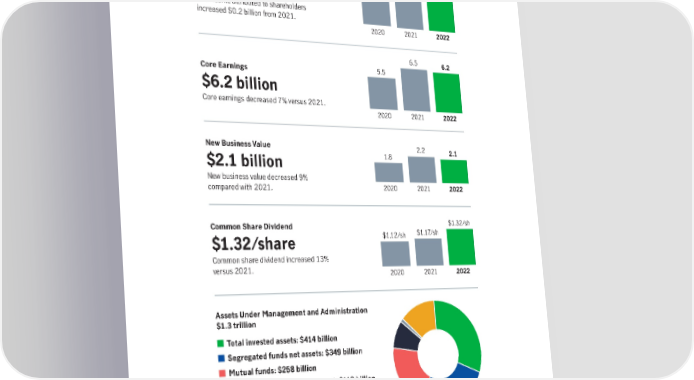 Manulife by the numbers 7.1 7.3 Net Income Attributed to Shareholders 5.9 $7.3 billion Net income attributed to shareholders increased $0.2 billion from 2021. 2020 2021 2022 6.5 6.2 Core Earnings 5.5 $6.2 billion Core earnings decreased 7% versus 2021. 2020 2021 2022 New Business Value 2.2 2.1 $2.1 billion 1.8 New business value decreased 9% compared with 2021. 2020 2021 2022 Common Share Dividend $1.32/sh $1.32/share $1.12/sh $1.17/sh Common share dividend increased 13% versus 2021. 2020 2021 2022 Assets Under Management and Administration $1.3 trillion Total invested assets: $414 billion Segregated funds net assets: $349 billion Mutual funds: $258 billion Institutional asset management: $110 billion Other funds: $14 billion Assets under administration: $170 billion Note: Core earnings and assets under management and administration are non-GAAP financial measures and percentage change in core earnings on a constant exchange rate basis is a non-GAAP ratio. Percentage change in new business value is also on a constant exchange rate basis. For more information on non-GAAP and other specified financial measures used in this report, see the section “Non-GAAP and Other Financial Measures” in our 2022 Management’s Discussion and Analysis below. 1