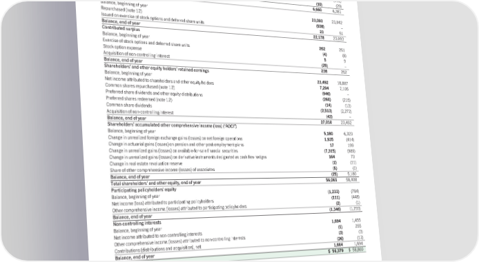 ConsolidatedStatementsofChangesinEquity For the years ended December 31, (Canadian $ in millions) 2022 2021 Preferred shares and other equity Balance, beginning of year $ 6,381 $ 3,822 Issued (note 12) 1,000 3,200 Redeemed (note 12) (711) (612) Issuance costs, net of tax (10) (29) Balance, end of year 6,660 6,381 Common shares Balance, beginning of year 23,093 23,042 Repurchased (note 12) (938) – Issued on exercise of stock options and deferred share units 23 51 Balance, end of year 22,178 23,093 Contributed surplus Balance, beginning of year 262 261 Exercise of stock options and deferred share units (4) (8) Stock option expense 5 9 Acquisition of non-controlling interest (25) – Balance, end of year 238 262 Shareholders’ and other equity holders’ retained earnings Balance, beginning of year 23,492 18,887 Net income attributed to shareholders and other equity holders 7,294 7,105 Common shares repurchased (note 12) (946) – Preferred share dividends and other equity distributions (260) (215) Preferred shares redeemed (note 12) (14) (13) Common share dividends (2,513) (2,272) Acquisition of non-controlling interest (43) – Balance, end of year 27,010 23,492 Shareholders’ accumulated other comprehensive income (loss) (“AOCI”) Balance, beginning of year 5,180 6,323 Change in unrealized foreign exchange gains (losses) on net foreign operations 1,935 (414) Change in actuarial gains (losses) on pension and other post-employment plans 17 199 Change in unrealized gains (losses) on available-for-sale financial securities (7,315) (989) Change in unrealized gains (losses) on derivative instruments designated as cash flow hedges 164 73 Change in real estate revaluation reserve (1) (11) Share of other comprehensive income (losses) of associates (5) (1) Balance, end of year (25) 5,180 Total shareholders’ and other equity, end of year 56,061 58,408 Participating policyholders’ equity Balance, beginning of year (1,233) (784) Net income (loss) attributed to participating policyholders (111) (448) Other comprehensive income (losses) attributed to participating policyholders (2) (1) Balance, end of year (1,346) (1,233) Non-controlling interests Balance, beginning of year 1,694 1,455 Net income attributed to non-controlling interests (1) 255 Other comprehensive income (losses) attributed to non-controlling interests (3) (3) Contributions (distributions and acquisition), net (26) (13) Balance, end of year 1,664 1,694 Total equity, end of year $ 56,379 $ 58,869 TheaccompanyingnotesareanintegralpartoftheseConsolidatedFinancialStatements. 143