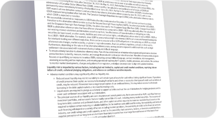 The global interest rate benchmark reform, leading to the transition away from LIBOR / IBOR to alternative reference rates based on risk-free rates, may impact the value of our IBOR-based financial instruments. • Manulife holds different types of instruments, including derivatives, bonds, loans, and other floating rate instruments that reference LIBOR (London Interbank Offered Rate) or other Interbank Offered Rates (IBORs). As previously announced by the U.K. Financial Conduct Authority (FCA) in July 2017, the FCA will no longer compel panel banks to submit rate information used to determine LIBOR post 2021. On March 5, 2021, the Intercontinental Exchange Benchmark Administration, the administrator of LIBOR, announced that it will cease the publication of one-week and two-month USD LIBOR and all non-USD (GBP, EUR, CHF, and JPY) LIBOR settings at the end of December 2021, but will extend the publication of the remaining USD LIBOR tenors (overnight and one, three, six and 12 month USD LIBOR) until the end of June 2023. In addition, on June 22, 2021, OSFI published a letter setting out their expectation that Federally Regulated Financial Institutions (FRFIs) will stop using USD LIBOR as a reference rate as soon as possible and will not enter into transactions referencing these rates after December 31, 2021. On May 16, 2022, Refinitiv Benchmark Services (UK) Limited (RBSL), the administrator of Canadian Dollar Offered Rate (CDOR), announced that the calculation and publication of all tenors of CDOR will permanently cease immediately following a final publication on June 28, 2024. Further to the confirmation of CDOR’s cessation date, OSFI expects all new derivative contracts and securities to transition to alternative reference rates by June 30, 2023, with no new CDOR exposure being booked after that date. The Canadian Overnight Repo Rate Average (CORRA) is the alternative reference rate to which CDOR is expected to transition. • We successfully converted our exposures to LIBOR rates that decommissioned on December 31, 2021 and we continue to actively transition to the alternative reference rates such as the Secured Overnight Financing Rate (SOFR), the alternative rate for USD LIBOR, and the Singapore Overnight Rate Average (SORA), the alternative rate for the Singapore Swap Offer Rate (SOR). Changes from LIBOR / IBOR to alternative reference rates that have different characteristics compared to LIBOR / IBOR may adversely affect the valuation of our existing interest-rate linked and derivatives securities we hold, the effectiveness of those derivatives in mitigating our risks, securities we have issued, or other assets, liabilities and other contractual rights, and obligations whose value is tied to LIBOR / IBOR or to a LIBOR / IBOR alternative. For example, since SOFR is a secured overnight rate whereas LIBOR is an unsecured forward-looking rate for interbank funding over different maturities, there can be no assurance that SOFR will perform in the same way as LIBOR as a result of interest rate changes, market volatility, or global or regional economic, financial, political, regulatory, judicial, or other events. Furthermore, depending on the nature of the alternative reference rate, we may become exposed to additional risks such as legal settlement risk associated with instruments having inadequate fallback language. • To ensure a timely transition to alternative reference rates, Manulife has established an enterprise-wide program and governance structure across functions to identify, measure, monitor, and manage financial and non-financial risks of transition. Manulife’s enterprise-wide program focuses on quantifying our exposures to various IBORs, evaluating contract fallback language, contract remediation, risk management, assessing accounting and tax implications, and ensuring operational readiness for IT systems, models, processes, and controls. We continue to monitor market developments, changes and guidance from regulators, and adjust our project plan to align with updated timelines. Liquidity risk is impacted by various factors, including but not limited to, capital and credit market conditions, repricing risk on letters of credit, collateral pledging obligations, and reliance on confidence sensitive deposits. • Adverse market conditions may significantly affect our liquidity risk. O Reduced asset liquidity may restrict our ability to sell certain types of assets for cash without taking significant losses. If providers of credit preserve their capital, our access to borrowing from banks and others or access to other types of credit such as letters of credit, may be reduced. If investors have a negative perception of our creditworthiness, this may reduce access to wholesale borrowing in the debt capital markets or increase borrowing costs. O Liquid assets are required to pledge as collateral to support activities such as the use of derivatives for hedging purposes and to cover cash settlement associated with such derivatives. O The principal sources of our liquidity are cash, insurance and annuity premiums, fee income earned on AUM, cash flow from our investment portfolios, and our assets that are readily convertible into cash, including money market securities. The issuance of long-term debt, common and preferred shares, and other capital securities may also increase our available liquid assets or be required to replace certain maturing or callable liabilities. In the event we seek additional financing, the availability and terms of such financing will depend on a variety of factors including market conditions, the availability of credit to the financial services industry, our credit ratings and credit capacity, as well as the possibility that customers, lenders, or investors could develop a negative perception of our long-term or short-term financial prospects if we incur large financial losses or if the level of our business activity decreases due to a significant mark