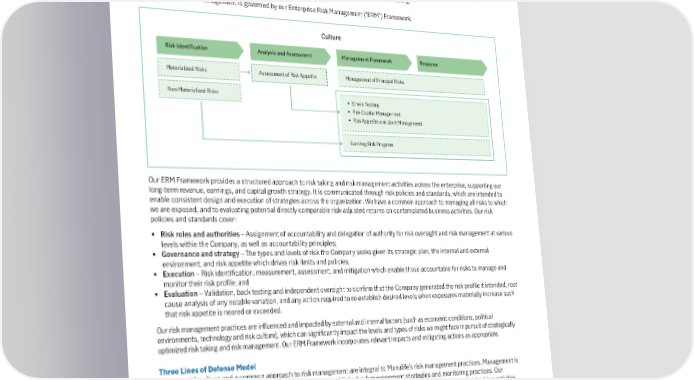 9. Risk Management and Risk Factors This section provides an overview of our overall risk management approach along with detailed description of specific risks which may affect our results of operations or financial condition and the strategies used to manage those risks. Enterprise Risk Management Framework Delivering on our mission “Decisions made easier. Lives made better”, our ambition is to be the most digital, customer-centric global company in our industry. The activities required to achieve these results involve elements of risk taking. Our approach to risk management is governed by our Enterprise Risk Management (“ERM”) Framework. Culture Risk Identification Analysis and Assessment Management Framework Response Materialized Risks Assessment of Risk Appetite Management of Principal Risks Non-Materialized Risks • Stress Testing • Risk Capital Management • Risk Appetite and Limit Management Evolving Risk Program Our ERM Framework provides a structured approach to risk taking and risk management activities across the enterprise, supporting our long-term revenue, earnings, and capital growth strategy. It is communicated through risk policies and standards, which are intended to enable consistent design and execution of strategies across the organization. We have a common approach to managing all risks to which we are exposed, and to evaluating potential directly comparable risk-adjusted returns on contemplated business activities. Our risk policies and standards cover: • Risk roles and authorities – Assignment of accountability and delegation of authority for risk oversight and risk management at various levels within the Company, as well as accountability principles; • Governance and strategy – The types and levels of risk the Company seeks given its strategic plan, the internal and external environment, and risk appetite which drives risk limits and policies; • Execution – Risk identification, measurement, assessment, and mitigation which enable those accountable for risks to manage and monitor their risk profile; and • Evaluation – Validation, back testing and independent oversight to confirm that the Company generated the risk profile it intended, root cause analysis of any notable variation, and any action required to re-establish desired levels when exposures materially increase such that risk appetite is neared or exceeded. Our risk management practices are influenced and impacted by external and internal factors (such as economic conditions, political environments, technology and risk culture), which can significantly impact the levels and types of risks we might face in pursuit of strategically optimized risk taking and risk management. Our ERM Framework incorporates relevant impacts and mitigating actions as appropriate. ThreeLinesofDefenseModel A strong risk culture and a common approach to risk management are integral to Manulife’s risk management practices. Management is responsible for managing risk within risk appetite and has established risk management strategies and monitoring practices. Our approach to risk management includes a “three lines of defense” governance model that segregates duties among risk taking activities, risk monitoring and risk oversight, and establishes appropriate accountability for those who assume risk versus those who oversee risk. Our first line of defense includes the Chief Executive Officer (“CEO”), Segment and Business Unit General Managers, Global Function Heads and all business operations personnel. In our matrix reporting model, the Segment General Managers are ultimately accountable for their business results, the risks they assume to achieve those results, and for the day-to-day management of the risks and related controls, and the Global Function Heads are accountable for the management of the risks and related controls for their function. The second line of defense is comprised of the Company’s Chief Risk Officer (“CRO”), the Global Risk Management (“GRM”) function, the Company’s Chief Compliance Officer and the Global Compliance Office, and other global oversight functions. Collectively, this group 46 | 2022AnnualReport | Management’sDiscussionandAnalysis