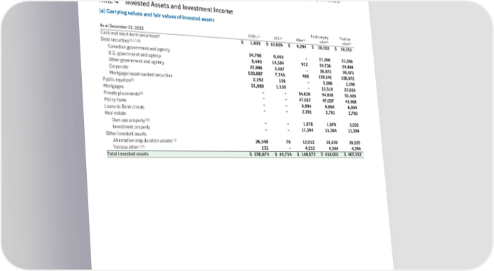 Note 3 Acquisitions (a) ManulifeTEDAFundManagement In November, 2022 the Company acquired control of Manulife TEDA Fund Management Co., LTD through the purchase of the remaining 51% of shares that it did not already own from its joint venture partner. The transaction furthers the Company’s goals of expanding both its Asian and asset management businesses. The transaction included $334 of cash consideration and derecognition of the Company’s previous joint venture interest with a fair value of $321. The Company recorded a gain of $95 on derecognition of the previous joint venture interest. The Company recognized $160 of tangible net assets, $240 of intangible assets and $255 of goodwill. Note 4 Invested Assets and Investment Income (a) Carryingvaluesandfairvaluesofinvestedassets Total carrying Total fair (1) (2) (3) (4) (5) As at December 31, 2022 FVTPL AFS Other value value (6) Cash and short-term securities $ 1,933 $ 10,926 $ 6,294 $ 19,153 $ 19,153 (3),(7),(8) Debt securities Canadian government and agency 14,798 6,468 – 21,266 21,266 U.S. government and agency 9,440 14,384 912 24,736 24,494 Other government and agency 22,986 3,487 – 26,473 26,473 Corporate 120,897 7,745 499 129,141 128,972 Mortgage/asset-backed securities 2,152 136 – 2,288 2,288 (9) Public equities 21,989 1,530 – 23,519 23,519 Mortgages – – 54,638 54,638 51,429 (8) Private placements – – 47,057 47,057 41,968 Policy loans – – 6,894 6,894 6,894 Loans to Bank clients – – 2,781 2,781 2,760 Real estate (10) Own use property – – 1,878 1,878 3,033 Investment property – – 11,394 11,394 11,394 Other invested assets (11) Alternative long-duration assets 26,348 79 12,012 38,439 39,225 (12) Various other 131 – 4,213 4,344 4,344 Total invested assets $ 220,674 $ 44,755 $ 148,572 $ 414,001 $ 407,212 160 | 2022AnnualReport | NotestoConsolidatedFinancialStatements