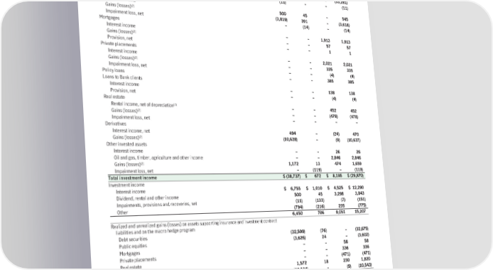 (c) Investmentincome (1) For the year ended December 31, 2022 FVTPL AFS Other Total Cash and short-term securities Interest income $ 40 $ 272 $ – $ 312 (2) Gains (losses) 26 85 – 111 Debt securities Interest income 6,221 738 66 7,025 (2) Gains (losses) (32,732) (549) – (33,281) Recovery (impairment loss), net (11) – – (11) Public equities Dividend income 500 45 – 545 (2) Gains (losses) (3,819) 201 – (3,618) Impairment loss, net – (14) – (14) Mortgages Interest income – – 1,913 1,913 (2) Gains (losses) – – 57 57 Provision, net – – 1 1 Private placements Interest income – – 2,021 2,021 (2) Gains (losses) – – 335 335 Impairment loss, net ––(4)(4) Policy loans – – 385 385 Loans to Bank clients Interest income – – 138 138 Provision, net ––(4)(4) Real estate (3) Rental income, net of depreciation – – 452 452 (2) Gains (losses) – – (478) (478) Impairment loss, net – – – – Derivatives Interest income, net 494 – (24) 470 (2) Gains (losses) (10,628) – (9) (10,637) Other invested assets Interest income – – 26 26 Oil and gas, timber, agriculture and other income – – 2,846 2,846 (2) Gains (losses) 1,172 13 474 1,659 Impairment loss, net – (119) – (119) Total investment income $(38,737) $ 672 $ 8,195 $(29,870) Investment income Interest income $ 6,755 $ 1,010 $ 4,525 $ 12,290 Dividend, rental and other income 500 45 3,298 3,843 Impairments, provisions and recoveries, net (11) (133) (7) (151) Other (794) (216) 235 (775) 6,450 706 8,051 15,207 Realized and unrealized gains (losses) on assets supporting insurance and investment contract liabilities and on the macro hedge program Debt securities (32,599) (76) – (32,675) Public equities (3,626) 24 – (3,602) Mortgages – – 58 58 Private placements – – 336 336 Real estate – – (471) (471) Other invested assets 1,572 18 230 1,820 Derivatives, including macro hedge program (10,534) – (9) (10,543) (45,187) (34) 144 (45,077) Total investment income $(38,737) $ 672 $ 8,195 $(29,870) 162 | 2022AnnualReport | NotestoConsolidatedFinancialStatements