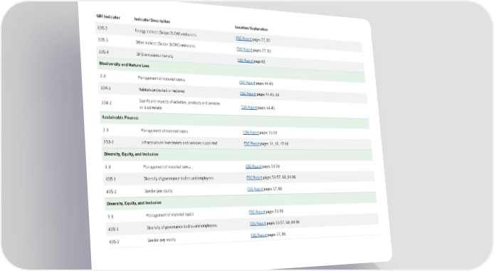 GRI Indicator Indicator Description Location/Explanation 305-2 Energy indirect (Scope 2) GHG emissions ESG Report pages 27, 82 305-3 Other indirect (Scope 3) GHG emissions ESG Report pages 27, 82 305-4 GHG emissions intensity ESG Report page 83 Biodiversity and Nature Loss 3-3 Management of material topics ESG Report pages 44-45 304-3 Habitats protected or restored ESG Report pages 44-45, 83 304-2 Significant impacts of activities, products and services ESG Report pages 44-45 on biodiversity Sustainable Finance 3-3 Management of material topics ESG Report pages 15-20 203-1 Infrastructure investments and services supported ESG Report pages 14, 16, 47-48 Diversity, Equity, and Inclusion 3-3 Management of material topics ESG Report pages 53-58 405-1 Diversity of governance bodies and employees. ESG Report pages 53-57, 68, 84-86 405-2 Gender pay equity ESG Report pages 57, 86 Diversity, Equity, and Inclusion 3-3 Management of material topics ESG Report pages 53-58 405-1 Diversity of governance bodies and employees. ESG Report pages 53-57, 68, 84-86 405-2 Gender pay equity ESG Report pages 57, 86