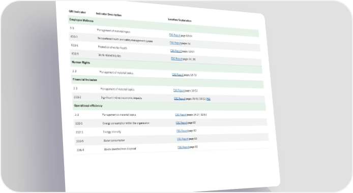 GRI Indicator Indicator Description Location/Explanation Employee Wellness 3-3 Management of material topics ESG Report page 63-64 403-1 Occupational health and safety management system ESG Report pages 64 403-6 Promotion of worker health ESG Report pages 63-64 403-9 Work-related injuries ESG Report pages 64, 86 Human Rights 3-3 Management of material topics ESG Report pages 69-70 Financial Inclusion 3-3 Management of material topics ESG Report pages 50-52 203-2 Significant indirect economic impacts ESG Report pages 36-43, 50-52; PAS Operational efficiency 3-3 Management of material topics ESG Report pages 24-27, 82-83 302-1 Energy consumption within the organization ESG Report page 82 302-3 Energy intensity ESG Report page 82 303-5 Water consumption ESG Report page 83 306-4 Waste diverted from disposal ESG Report page 83