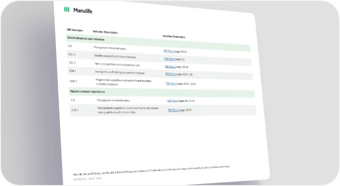 GRI Indicator Indicator Description Location/Explanation Talent attraction and retention 3-3 Management of material topics ESG Report pages 59-62 401-2 Benefits provided to full-time employees ESG Report pages 63 401-1 New employee hires and employee turnover ESG Report pages 59, 84 404-1 Average hours of training per year per employee ESG Report pages 60-61, 84 404-2 Programs for upgrading employee skills and transition ESG Report pages 60-61, 63-64 assistance programs Digital customer experience 3-3 Management of material topics ESG Report pages 65, 74-75 418-1 Substantiated complaints concerning breaches of customer ESG Report pages 74-75 privacy and losses of customer data Manulife, Stylized M Design, and Manulife & Stylized M Design are trademarks of The Manufacturers Life Insurance Company and are used by it, and by its affiliates under license. MP2290237E 05/23 AODA