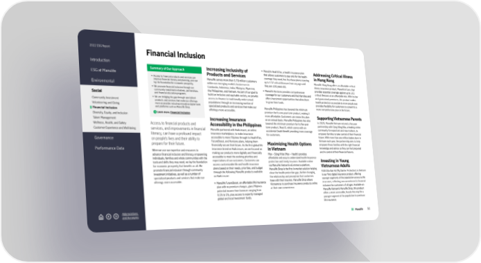 2022 ESG Report Introduction ESG at Manulife Environmental Social Community Investment Volunteering and Giving Financial Inclusion Diversity, Equity, and Inclusion Talent Management Wellness, Health, and Safety Customer Experience and Well-being Governance Performance Data Abbreviations and Acronyms Financial Inclusion Summary of Our Approach • Access to financial products and services can improve financial literacy and planning, and can lay the foundation for economic prosperity. • We promote financial inclusion through our community investment initiatives, partnerships, and financial education programs. • We are bridging the gap through specialized products and services that make our offerings more accessible including innovative digital tools and platforms such as Manulife Shop. Learn more: Financial Inclusion Access to financial products and services, and improvements in financial literacy, can have a profound impact on people’s lives and their ability to prepare for their future. When we use our expertise and resources to advance financial inclusion and literacy, empowering individuals, families and whole communities with the tools and skills they may need, we lay the foundation for economic prosperity that benefits us all. We promote financial inclusion through community investment initiatives, as well as a number of specialized products and services that make our offerings more accessible. Increasing Inclusivity of Products and Services Manulife serves more than 5.78 million customers within our emerging markets businesses in Cambodia, Indonesia, India, Malaysia, Myanmar, the Philippines, and Vietnam. As part of our goal to build an inclusive and equitable society, we provide access to finance to traditionally underserved populations through an increasing number of specialized products and services that make our offerings more accessible. Increasing Insurance Accessibility in the Philippines Manulife partnered with Kwik.insure, an online insurance marketplace, to make insurance accessible to more Filipinos through its HealthFlex, FutureBoost, and Horizons plans, helping them financially secure their future. As the first global life insurance brand on Kwik.insure, we are focused on making our products more digitally and financially accessible to meet the evolving priorities and expectations of our customers. Customers can access customizable life and health insurance plans based on their needs, priorities, and budget through the following Manulife products available on Kwik.insure: • Manulife FutureBoost, an affordable life insurance plan with no premium charges, gives Filipinos potential income from bonuses ranging from 0.5% to 5%, plus access to expertly managed global and local investment funds. • Manulife HealthFlex, a health insurance plan that allows customers to pay only for the health coverage they need, has four base plans covering up to 112 critical illnesses from any age until they are 100 years old. • Manulife Horizons provides comprehensive coverage for our customers and their families and offers investment opportunities that allow them to grow their funds. Manulife Philippines has lowered the minimum premium for its one-year term product, making it more affordable. Customers can renew this plan on an annual basis. Manulife Philippines has also lowered the minimum premium for its five-year term product, React5, which comes with an accidental Death Benefit providing more coverage for customers. Maximizing Health Options in Vietnam Max – Sống Khỏe (Max – Health) provides affordable and easy-to-understand health insurance protection and timely issuance. Available online via Manulife Vietnam’s eCommerce platform, Manulife Shop is the first in-market solution helping close the health protection gap, further changing the relationship and perception that customers have with their insurers. Manulife Shop allows Vietnamese to purchase insurance products online at their own convenience. Addressing Critical Illness in Hong Kong Manulife Hong Kong offers an affordable critical illness insurance product, ManuVital Care, that provides essential coverage against up to 112 critical illnesses at an affordable rate. With its low and guaranteed premiums, this product makes health protection accessible to more people and provides flexibility for customers to convert to a more comprehensive plan in the future. Supporting Vietnamese Parents In 2020, Manulife Vietnam entered a five-year partnership with Cộng Đồng Bầu, a leading online community for expectant and new mothers, to empower families to take control of their financial future. With more than one million babies born in Vietnam each year, the partnership aims to help empower these families with the right financial knowledge and advice so they can feel prepared and in control of their financial futures. Investing in Young Vietnamese Adults Khởi Đầu Bảo Vệ (My Starter Protection) in Vietnam is our first digital insurance product, offering younger segments of the population access to life insurance, reflecting our commitment to financial inclusion for customers of all ages. Available on Manulife Vietnam’s Manulife Shop, this product offers a more accessible, hassle-free way for a younger segment of the population to purchase life insurance. 50