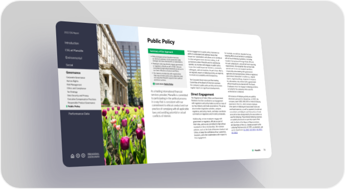 2022 ESG Report Introduction ESG at Manulife Environmental Social Governance Corporate Governance Human Rights Risk Management Ethics and Compliance Tax Strategy Data Security and Privacy Executive Compensation Practices Responsible Product Governance Public Policy Performance Data Abbreviations and Acronyms Public Policy Summary of Our Approach • Policy dialogue and participation improves our ability to address critical issues and make strategic decisions that benefit our stakeholders. • Employees who may directly engage government or regulatory officials as part of their roles are committed to high ethical standards as set out in our Code of Business Conduct and Ethics. • Our industry membership with organizations that may promote public policy objectives does not imply that Manulife supports their political position or actions. Learn more: Public Policy As a leading international financial services provider, Manulife is committed to participating in the political process in a way that is consistent with our commitment to ethical conduct and our practice of complying with all applicable laws and avoiding potential or actual conflicts of interest. Active engagement in public policy improves our ability to understand and address issues that impact our stakeholders and allows us to contribute to informed government decision-making. In all jurisdictions where Manulife and its subsidiaries operate, we monitor and engage on public policy issues that could impact our business, customers, colleagues, and communities. As part of our efforts, we regularly report on lobbying activity, as required, to ensure accountability and transparency. The Corporate Governance and Nominating Committee of the Board of Directors oversees the company’s public policy activity and receives regular reports on significant developments. Direct Engagement The Regulatory & Public Affairs and Government Relations function coordinates our engagement with regulators and policymakers as well as many of our key industry and trade associations. The group also monitors legislative activities, analyzes regulatory and policy trends, and helps coordinate comments on regulatory and/or policy proposals. Additionally, certain employees engage with government or regulatory officials as part of their roles, and we are committed to high ethical standards in these relationships. We maintain policies, such as the Code of Business Conduct and Ethics, to keep the confidence of our customers, investors, and other stakeholders with respect to this engagement. For example, our policies stipulate that any lobbying efforts must be done in compliance with all local lobbying regulations, including Canada’s Corruption of Foreign Public Officials Act and Lobbying Act, and with all local reporting requirements. We recognize that we must take special care to use our corporate positions responsibly when dealing with government agencies and representatives. Unless a regulatory/ government interaction is routine e.g., regular exams, regulatory filings, response to requests for information, any contact with a government official should be pre-cleared with The Board. Employees must not engage in lobbying activities on behalf of the company unless specific authorization is obtained. All instances of lobbying activity are publicly disclosed, pursuant to relevant law. In 2022, the company spent US$1,060,000 on federal lobbying expenses in the U.S., which include employee time spent on lobbying and associated travel and overhead expenses, as well as payments to external consultants and lobbyists and that portion of trade association dues designated by the associations as used for lobbying. These federal lobbying expenses are publicly disclosed on quarterly reports filed with the Clerk of the House of Representatives and Secretary of the U.S. Senate pursuant to the Lobbying Disclosure Act of 1995, as amended, and can be found here: Q1 2022 , Q2 2022 , Q3 2022 , Q4 2022 . 78