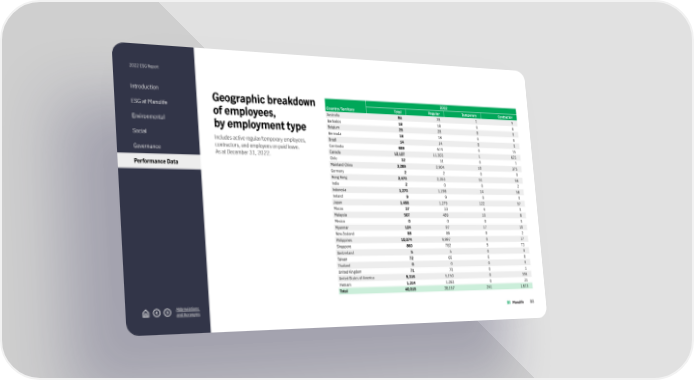 2022 ESG Report Introduction ESG at Manulife Environmental Social Governance Performance Data Abbreviations and Acronyms Geographic breakdown of employees, by employment type Includes active regular/temporary employees, contractors, and employees on paid leave. As at December 31, 2022. Country/Territory 2022 Total Regular Temporary Contractor Australia 84 78 1 5 Barbados 18 18 0 0 Belgium 28 28 0 0 Bermuda 18 18 0 0 Brazil 14 14 0 0 Cambodia 689 674 0 15 Canada 12,127 11,503 1 623 Chile 32 31 0 1 Mainland China 3,289 2,904 10 375 Germany 2 2 0 0 Hong Kong 2,470 2,353 51 66 India 2 0 0 2 Indonesia 1,270 1,198 14 58 Ireland 9 9 0 0 Japan 1,498 1,279 122 97 Macau 37 33 4 0 Malaysia 507 489 10 8 Mexico 0 0 0 0 Myanmar 124 97 17 10 New Zealand 88 86 0 2 Philippines 10,074 9,997 0 77 Singapore 860 782 5 73 Switzerland 5 5 0 0 Taiwan 72 66 6 0 Thailand 0 0 0 0 United Kingdom 71 70 0 1 United States of America 5,316 5,150 0 166 Vietnam 1,314 1,283 0 31 Total 40,018 38,167 241 1,610 88