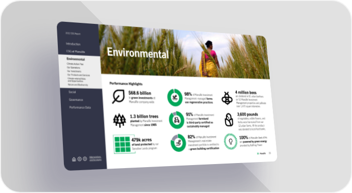 2022 ESG Report Introduction ESG at Manulife Environmental Climate Action Plan Our Operations Our Investments Our Products and Services Climate-related Risks and Opportunities Nature and Biodiversity Social Governance Performance Data Abbreviations and Acronyms Environmental Performance Highlights $68.6 billion in green investments at Manulife company-wide 1.3 billion trees planted by Manulife Investment Management since 1985 479k acres of land protected by our Sensitive Lands program 98% of Manulife Investment Management–managed farms use regenerative practices 91% of Manulife Investment Management farmland is third-party certified as sustainably managed 82% of Manulife Investment Management’s real estate investment portfolio is certified to a green building certification 4 million bees are sheltered in 81 urban beehives on 52 Manulife Investment Management properties and pollinate over 1,470 square kilometres 3,600 pounds of vegetables, edible flowers, and herbs were harvested from our 12 urban farms. All the produce was donated to local food banks. 10 0% of Manulife Bank ATMs are powered by green energy provided by Bullfrog Power 23