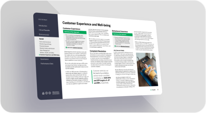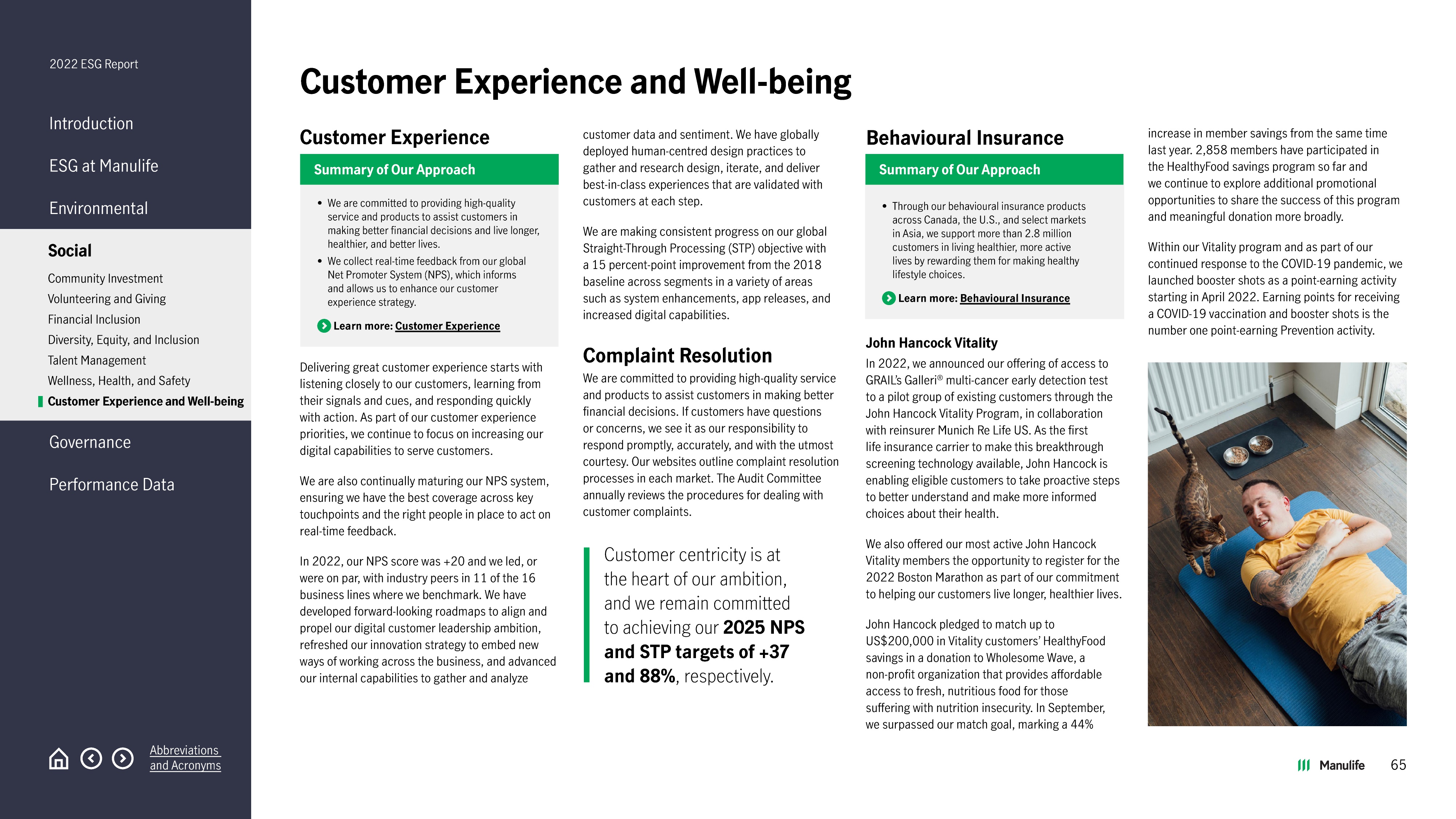 2022 ESG Report Introduction ESG at Manulife Environmental Social Community Investment Volunteering and Giving Financial Inclusion Diversity, Equity, and Inclusion Talent Management Wellness, Health, and Safety Customer Experience and Well-being Governance Performance Data Abbreviations and Acronyms Customer Experience and Well-being Customer Experience Summary of Our Approach • We are committed to providing high-quality service and products to assist customers in making better financial decisions and live longer, healthier, and better lives. • We collect real-time feedback from our global Net Promoter System (NPS), which informs and allows us to enhance our customer experience strategy. Learn more: Customer Experience Delivering great customer experience starts with listening closely to our customers, learning from their signals and cues, and responding quickly with action. As part of our customer experience priorities, we continue to focus on increasing our digital capabilities to serve customers. We are also continually maturing our NPS system, ensuring we have the best coverage across key touchpoints and the right people in place to act on real-time feedback. In 2022, our NPS score was +20 and we led, or were on par, with industry peers in 11 of the 16 business lines where we benchmark. We have developed forward-looking roadmaps to align and propel our digital customer leadership ambition, refreshed our innovation strategy to embed new ways of working across the business, and advanced our internal capabilities to gather and analyze customer data and sentiment. We have globally deployed human-centred design practices to gather and research design, iterate, and deliver best-in-class experiences that are validated with customers at each step. We are making consistent progress on our global Straight-Through Processing (STP) objective with a 15 percent-point improvement from the 2018 baseline across segments in a variety of areas such as system enhancements, app releases, and increased digital capabilities. Complaint Resolution We are committed to providing high-quality service and products to assist customers in making better financial decisions. If customers have questions or concerns, we see it as our responsibility to respond promptly, accurately, and with the utmost courtesy. Our websites outline complaint resolution processes in each market. The Audit Committee annually reviews the procedures for dealing with customer complaints. Customer centricity is at the heart of our ambition, and we remain committed to achieving our 2025 NPS and STP targets of +37 and 88% , respectively. Behavioural Insurance Summary of Our Approach • Through our behavioural insurance products across Canada, the U.S., and select markets in Asia, we support more than 2.8 million customers in living healthier, more active lives by rewarding them for making healthy lifestyle choices. Learn more: Behavioural Insurance John Hancock Vitality In 2022, we announced our offering of access to GRAIL’s Galleri ® multi-cancer early detection test to a pilot group of existing customers through the John Hancock Vitality Program, in collaboration with reinsurer Munich Re Life US. As the first life insurance carrier to make this breakthrough screening technology available, John Hancock is enabling eligible customers to take proactive steps to better understand and make more informed choices about their health. We also offered our most active John Hancock Vitality members the opportunity to register for the 2022 Boston Marathon as part of our commitment to helping our customers live longer, healthier lives. John Hancock pledged to match up to US$200,000 in Vitality customers’ HealthyFood savings in a donation to Wholesome Wave, a non-profit organization that provides affordable access to fresh, nutritious food for those suffering with nutrition insecurity. In September, we surpassed our match goal, marking a 44% increase in member savings from the same time last year. 2,858 members have participated in the HealthyFood savings program so far and we continue to explore additional promotional opportunities to share the success of this program and meaningful donation more broadly. Within our Vitality program and as part of our continued response to the COVID-19 pandemic, we launched booster shots as a point-earning activity starting in April 2022. Earning points for receiving a COVID-19 vaccination and booster shots is the number one point-earning Prevention activity. 65
