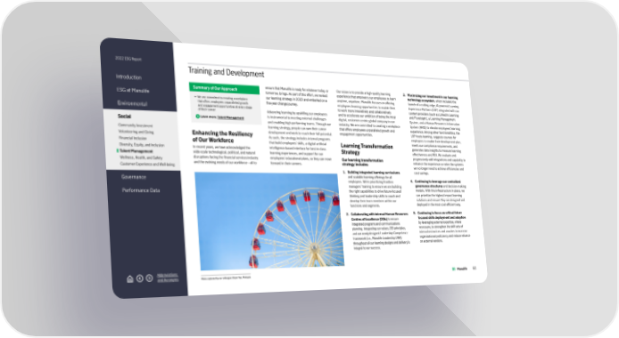 2022 ESG Report Introduction ESG at Manulife Environmental Social Community Investment Volunteering and Giving Financial Inclusion Diversity, Equity, and Inclusion Talent Management Wellness, Health, and Safety Customer Experience and Well-being Governance Performance Data Abbreviations and Acronyms Training and Development Summary of Our Approach • We are committed to creating a workplace that offers employees unparalleled growth and engagement opportunities at every stage of their career. Learn more: Talent Management Enhancing the Resiliency of Our Workforce In recent years, we have acknowledged the wide-scale technological, political, and natural disruptions facing the financial services industry and the evolving needs of our workforce – all to ensure that Manulife is ready for whatever today, or tomorrow, brings. As part of this effort, we revised our learning strategy in 2020 and embarked on a five-year change journey. Advancing learning by upskilling our employees is instrumental to meeting external challenges and enabling high-performing teams. Through our learning strategy, people can own their career development and work to reach their full potential. As such, the strategy includes internal programs that build employees’ skills, a digital artificial intelligence-based interface for best-in-class learning experiences, and support for our employees’ educational plans, so they can move forward in their careers. Our vision is to provide a high-quality learning experience that empowers our employees to learn anytime, anywhere. Manulife focuses on offering employees learning opportunities to enable them to work more innovatively and collaboratively and to accelerate our ambition of being the most digital, customer-centric global company in our industry. We are committed to creating a workplace that offers employees unparalleled growth and engagement opportunities. Learning Transformation Strategy Our learning transformation strategy includes: 1. Building integrated learning curriculums and scalable learning offerings for all employees. We’re prioritizing frontline managers’ training to ensure we are building the right capabilities to drive future-focused thinking and leadership skills to coach and develop their team members within our functions and segments. 2. Collaborating with internal Human Resources Centres of Excellence (COEs) to ensure integrated programs and communications planning. Integrating our values, DEI principles, and our newly designed Leadership Competence Framework (i.e., Manulife Leadership DNA) throughout all our learning designs and delivery is integral to our success. 3. Maximizing our investment in our learning technology ecosystem , which included the launch of a cutting-edge, AI-powered Learning Experience Platform (LXP) integrated with our content providers (such as LinkedIn Learning and Pluralsight), a Learning Management System, and a Human Resources Information System (HRIS) to elevate employees’ learning experience. Among other functionalities, the LXP hosts learning, suggests courses for employees to enable their development plan, meets our compliance requirements, and generates data insights to measure learning effectiveness and ROI. We evaluate and progressively add integrations and capability to enhance the experience or retire the systems we no longer need to achieve efficiencies and cost savings. 4. Continuing to leverage our centralized governance structures and decision-making models. With this infrastructure in place, we can prioritize the highest impact learning solutions and ensure they are designed and deployed in the most cost-efficient way. 5. Continuing to focus on critical future focused skills deployment and adoption by leveraging external expertise, where necessary, to strengthen the skill sets of internal instructors and coaches to increase organizational proficiency and reduce reliance on external vendors. Photo captured by our colleague: Bryan Yap, Malaysia 60