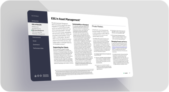 2022 ESG Report Introduction ESG at Manulife ESG Governance Sustainable Investing ESG in Asset Management ESG in Asset Ownership Partnerships and Engagements Environmental Social Governance Performance Data Abbreviations and Acronyms ESG in Asset Management 18 Manulife Investment Management values and actively supports the robust integration of sustainability principles across our investment approaches and active ownership activities. This holds true across asset classes, geographies, and our business identities, whether we are acting as asset operators, equity holders, or debt holders. We aim to deliver strong risk-adjusted investment returns for our clients over time, while helping realize a sustainable trajectory for the global economy. 19 Supporting Our Clients We are committed to a program of ongoing education on sustainability as we understand the importance of increasing knowledge, understanding, and awareness of ESG risks and opportunities that are material to financial outcomes. In 2022, we implemented the Manulife Investment Management Sustainable Investing Academy, an education curriculum that covers a range of key sustainability topics. The education program was made available to institutional investors in Canada, with the current objective of expanding to other markets in the future. Sustainability as Standard Our sustainable investing teams prepare annual sustainable investment goals to drive financial value creation and better sustainability outcomes. Individual team members have oversight and responsibility for the goal accomplishment. For example, goals for our private asset class investments teams include enhancing tools to integrate ESG factors throughout the investment life cycle and providing support to the development of new and existing products. Similarly, goals for our public markets investments teams include increasing impact of engagements, ESG integration success measures, system enhancements, and structured training sessions. Initially, the goals are presented by the sustainable investing teams to the respective private markets and public sustainable investment committees, which are composed of functional leads from legal, compliance, risk, and investment teams, for review and input. These goals are then reviewed continuously through execution of work plans, and the sustainable investing teams report activities and progress of the business plans to their respective committees. These goals are prioritized based on the impact they will have on the overall investment processes and the firm’s objective to achieve ongoing excellence in ESG integration. Our group of dedicated sustainable investment professionals reinforces and strengthens ESG integration and stewardship activities across our investment teams and asset classes. 18 The activities, p olicies, and processes of Manulife Investment Management described in this ESG Report are descriptive of practices of certain of our internal investment teams in our Private Markets and Public Markets business units, some of whom manage assets on behalf of the Manulife General Account. This Report does not reflect the investment activities or practices of non-affiliated asset managers who manage Manulife Investment Management-sponsored funds on our behalf. 19 Integr ation is based on Manulife Investment Management’s Proprietary Integration Progression Levels (IPL), which measures investment teams progress in ESG integration. We look to incorporate material ESG considerations throughout the stages of our investment and asset ownership lifecycles, taking into account the characteristics of the asset class and investment process in question, as well as industry and geography, among other factors. Each investment team operates in different markets and with different nuances to its approach to investing. Accordingly, each team integrates ESG factors into its investment process in a manner that best aligns with its investment approach. Private Markets In Real Assets, we are frequently both the asset manager and operator, which we believe positions us well to influence sustainable business practices and identify related concerns. For example, where we invest and operate assets in our real estate, timberland, and agriculture portfolios, we seek to raise the bar of sustainable investing and stewardship, while enhancing the value of our assets and having a positive impact on all our stakeholders. In our infrastructure, private equity, and credit investments, we focus on building strong relationships with companies, sponsors, and co-investors, which enables a meaningful approach to sustainability and enhances our influence over key assets and portfolio companies. Our strategies integrate ESG factors throughout the investment lifecycle: 1. We use our sustainable investing due diligence process, based on a combination of external resources including the SASB, the Principles for Responsible Investing (PRI), and our own internal expertise. 2. We document sustainable investing due diligence in an investment memorandum that is evaluated during the investment committee approval process. 3. We continue to monitor material aspects that might affect an asset or company, including ESG factors, once an investment is made. 4. We communicate ESG-related information regularly to our investors through our quarterly reports, at annual general meetings, or on an ad hoc basis when requested by investors. Managing Forests and Farms Our agriculture and timberland businesses exist to create value through the sustainable management of natural resource investments, as outlined in our Timberland and Agriculture Sustainable Investing Framework . As stewards of these natural capital assets, we recognize their intrinsic value far exceeds the commercial value of the land and the harvest alone. Our foundational principle is that good stewardship is good business, and we reflect this in the way we manage our investments with three major sustainability priorit