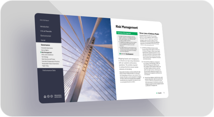 2022 ESG Report Introduction ESG at Manulife Environmental Social Governance Corporate Governance Human Rights Risk Management Ethics and Compliance Tax Strategy Data Security and Privacy Executive Compensation Practices Responsible Product Governance Public Policy Performance Data Abbreviations and Acronyms Risk Management Summary of Our Approach • Our Board of Directors, assisted primarily by the BRC, oversees our risk management efforts, which is governed by a robust Enterprise Risk Management (ERM) framework. • Our Global Risk Management function maintains our ERM framework and oversees execution of risk management programs across the enterprise. • Our ERM framework is communicated through risk policies and standards, intended to enable consistent design and execution of strategies across the organization. Learn more: Risk Management Mitigating hazards and managing risk is critical to our day-to-day interactions with our customers and business operations. The activities required to achieve the firm’s mission involve elements of risk-taking. Responsible risk-taking is all about striking the right balance between taking risk where it is necessary and safeguarding our business and customers’ best interests. We have a common approach to managing all risks to which we are exposed and to evaluating potential directly comparable risk-adjusted returns on contemplated business activities. Three Lines of Defense Model We have a strong risk culture and a common approach to risk management, which includes a “three lines of defense” governance model that segregates duties among risk taking activities, risk monitoring, and risk oversight and establishes appropriate accountability for those who assume risk versus those who oversee risk. 1. Our first line of defense includes the Chief Executive Officer (CEO), Segment and Business Unit General Managers, Global Function Heads, and all business operations personnel, who are ultimately responsible for their business results, the risks they assume to achieve those results, and for the day-to-day management of the risks and related controls. 2. The second line of defense is composed of the company’s Chief Risk Officer (CRO), the Global Risk Management (GRM) function, the company’s Chief Compliance Officer and the Global Compliance function, and other global oversight functions. Collectively, this group provides independent oversight of risk taking and risk management activities across the enterprise. 3. The third line of defense is Audit Services, which provides independent, objective assurance that controls are effective and appropriate relative to the risk inherent in the business and that risk mitigation programs and risk oversight functions are effective in managing risks. 71