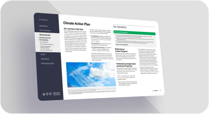 2022 ESG Report Introduction ESG at Manulife Environmental Climate Action Plan Our Operations Our Investments Our Products and Services Climate-related Risks and Opportunities Nature and Biodiversity Social Governance Performance Data Abbreviations and Acronyms Climate Action Plan Our Journey to Net Zero We are taking steps to reduce our environmental footprint, support the transition to a low carbon economy, and invest in climate change mitigation and resilience. Our business can make an impact through the investments we make and the ways in which we manage assets on behalf of our clients, including timberland, agriculture, and real estate. We acknowledge the serious threats posed by climate change to our business, society, and the livelihoods of the communities in which we operate. We also recognize the value of nature and the necessary betterment and protection of biodiversity. Our effort to combat climate change is embedded across our business strategy. We are taking steps to becoming a net zero company through: • Our operations: Real estate, timberland, and agriculture investment property operations and day-to-day business activities across Manulife’s business segments. • Our investments: Asset ownership under the management of the General Account. • Our products and services: Life and health insurance, and asset management and investment strategies on behalf of clients. Our Climate Change Statement summarizes our approach and more information can be found at Manulife.com/climate, which further outlines our commitments, across our operations, investments, products and services. Our Operations Summary of Our Approach • Our vast natural resource holdings enable us to realize net zero emissions in our operations 24 , and we have committed to reduce absolute emissions (scope 1 & 2) by 40% by 2035 25 . • We take action to minimize our operational footprint and reduce operating costs by preparing our businesses for a sustainable path forward. • We actively look for opportunities to work more effectively across our value chain to reduce Manulife’s broader emissions footprint, through aspects such as sustainable procurement and green leases. Learn more: Our Operations Reducing our Carbon Footprint Keeping our real estate, timberland, and agriculture operating takes energy. This year, we continued to deepen our understanding of our GHG emissions and assessed decarbonization opportunities across our properties. Timberland and Agriculture Investment Properties We are proud of the climate benefits of the carbon removals from our forests and farms and continue to go beyond carbon removal in pursuit of our emissions reduction goals. In 2022, we identified levers to reduce GHG emissions across our global timberland and agriculture portfolio: • Held sessions with timberland and agriculture senior leadership to discuss and socialize the decarbonization imperative. • Co-led a WBCSD Forest Solutions Groups project culminating in a report, Forest Sector Net-Zero Roadmap Phase I: Enabling the transition to a net-zero economy. This industry-wide collaboration by leading sustainable forestry companies identified most emissions reduction opportunities in the downstream value chain in processing and manufacturing as opposed to forest production, where levers include those we already practice (e.g., precision forestry, fire prevention measures) or those still relatively immature (e.g., fuel switching). • Invested in improving emissions data acquisition processes and accuracy to improve signal-to-noise ratio (i.e., tightening estimates and refining methodologies so that year-over-year changes can be measured more accurately). 24 W e are net zero in our operations as at December 31, 2022. This includes the following emissions categories: scope 1, scope 2, and select scope 3 emissions categories in our operations (paper use, data centres, waste, business travel, corporate leased properties). 25 Our commitment to emissions reductions apply to any properties where we have operational control. Manulife has developed interim targets as part of our Climate Action Plan in accordance with the methodology for financial institutions outlined by the SBTi. As a result of alignment to SBTi guidance, our target for scope 1 & 2 emissions reduction has been updated to 40% by 2035. 24