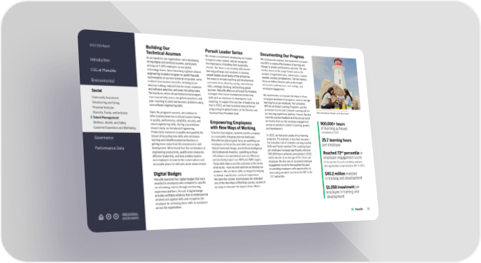 2022 ESG Report Introduction ESG at Manulife Environmental Social Community Investment Volunteering and Giving Financial Inclusion Diversity, Equity, and Inclusion Talent Management Wellness, Health, and Safety Customer Experience and Well-being Governance Performance Data Abbreviations and Acronyms Building Our Technical Acumen As we transform our organization, we’re developing strong digital and technical acumen, particularly among our 5,500 employees on our global technology teams. Since launching a global software engineering incubator program to upskill Manulife technologists on our new technical ecosystem, we’ve realized clear business benefits, including faster decision-making, reduced time for issues resolution and software selection, and lower recruiting costs. The hands-on, micro virtual instructor-led program runs concurrently across our global operations, with peer coaching to solve real business problems using core software engineering skills. Given the program’s success, we continue to offer mastery-level micro virtual course training in quality, performance, reliability, security, and cloud engineering skills. During a quantitative impact study, we introduced Engineering Productivity measures to qualify and quantify the impact of acquiring new skills and continuous learning and identified potential blockers to getting more value from this investment in skill development. We’ve found that the combination of engineering productivity, qualification measures, effective leadership, and data enables leaders and employees to have better conversations and actionable plans for skill and career advancement. Digital Badges Manulife launched four digital badges that were awarded to employees who completed a specific set of learning criteria through our learning experience platform, Pursuit. A digital badge provides verifiable evidence that an employee has attained and applied skills and recognizes the employee for achieving these skills to employees across the organization. Pursuit Leader Series We remain committed to developing our leaders to lead in a new context, and we recognize the importance of building their leadership muscle. Our focus is on creating skills-based learning pathways and solutions to develop people leaders at all levels of the enterprise. Key aspects include coaching and development, communication, diversity, equity, and inclusion (DEI), strategic thinking, and building global acumen. Manulife offers a curriculum for frontline managers that covers foundational leadership skills with an emphasis on development and coaching. To support the next tier of leadership and new in 2023, we have launched state-of-the-art programing for global leaders at the Director and Assistant Vice President level. Empowering Employees with New Ways of Working To be the most digital, customer-centric company in a constantly changing external landscape, Manulife has placed great focus on upskilling our employees on future focused skills such as Agile, Human Centered Design, and Artificial Intelligence (AI) & Advanced Analytics. Upskilling on these will enhance our operational and cost efficiency and positively impact our rNPS and tNPS targets. These skills help us put the customer at the centre of all we do – how we work and how we develop our products. We see these skills as integral to helping us deliver a world-class customer experience. We track the number of employees who attended one of the New Ways of Working courses, as part of our ways to measure the impact of our efforts. Documenting Our Progress We continuously evaluate and implement measures and KPIs to assess effectiveness of learning and linkage to people and business outcome. Tier one metrics focus on the usage funnel such as the number of registered users, active users, courses started, courses completed etc. Tier two metrics focus on indirect factors such as the impact on business performance, cost savings, and employee engagement. We track metrics to measure the impacts of our employee development programs, such as average learning hours per employee, the cumulative NPS for all Global Learning Programs, and the activation rate for both LinkedIn Learning and for our learning experience platform, Pursuit. We also track the positive feedback and the annual trend we receive from our full employee engagement survey on questions related to learning, growth, and development. In 2022, we had great uptake of our learning programs. For example, in less than two years, the activation rate of LinkedIn Learning reached 83% and Pursuit reached 75%. Learning hours per employee increased significantly with over 900,000 hours achieved cumulatively in 2022, which equates to an average of 25.7 hours per employee. We also saw an increased employee engagement score for the question focused on providing employees with opportunities to learn and grow which rose from the 69 th to the 72 nd percentile. 900,000 + hours of learning achieved cumulatively in 2022 25.7 learning hours per employee Reached 72 nd percentile in employee engagement score for the question focused on providing employees with opportunities to learn and grow (69 th i n 2021) $40.2 million invested in training and development $1,059 investment per employee in training and development Photo captured by our colleague: Laurent Nzau, Canada 61