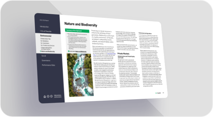 2022 ESG Report Introduction ESG at Manulife Environmental Climate Action Plan Our Operations Our Investments Our Products and Services Climate-related Risks and Opportunities Nature and Biodiversity Social Governance Performance Data Abbreviations and Acronyms Nature and Biodiversity Summary of Our Approach • We strive to take a nature-positive approach to our business activities • Nature and biodiversity are elements of our overall ESG integration framework and we are committed to protecting and restoring natural ecosystems through our financing activities and investments • As part of our enterprise-wide approach to managing environmental risks, we consider nature-related risks in our Environmental Risk Policy Learn more: Nature and Biodiversity Preserving our natural resources is critical to the well-being of future generations. Biodiversity is at the heart of a healthy environment. At Manulife, we believe in safeguarding forests, wetlands, and natural habitats where biodiversity thrives. Nature and biodiversity are two of several factors that may be incorporated in our assessment of overall environmental risks and opportunities as a component of the underwriting and monitoring of our investment portfolios. In our Environmental Risk Policy , we consider nature-related risks that could result in financial loss or reputational damage to the company as part of the enterprise-wide approach to managing environmental risks. Manulife Investment Management was a member of the informal working group for the Task Force on Nature-related Financial Disclosures (TNFD), working to develop the scope of that endeavor to deliver a risk management and disclosure framework for organizations to report and act on evolving nature-related risk. Manulife Investment Management pledged our continued support by becoming part of the TNFD Forum, a multi-disciplinary pool of supporters. In addition, Manulife Investment Management is signatory to the Finance for Biodiversity Pledge, where we sit on several working groups tasked with developing appropriate metrics and stewardship activities in support of asset manager commitments to protect biodiversity and reverse nature loss. By signing onto the pledge, we’ve committed to collaborate and engage with companies on biodiversity and assess our own biodiversity impact. This will enable Manulife Investment Management to set targets and disclose appropriate reporting on biodiversity aspects by 2025. Within our life and health insurance business, we consider the impacts of biodiversity on human health, and this research may help inform decisions related to our product and services offered. Private Markets Infrastructure and Private Equity and Credit Recognizing the need to systematically identify and assess material ESG risks and opportunities, our infrastructure and private equity and credit investment teams evaluate ESG considerations as a regular part of the underwriting process. Nature and biodiversity factors are assessed during due diligence and monitored post-investment, where material to the underlying investment. The Sustainable Investing team supports related due diligence and stewardship by providing expertise and research to investment teams. We continue to enhance and evolve how we integrate ESG into the investment process, including consideration of the role that our infrastructure and private equity and credit portfolios can play in the protection and preservation of biodiversity and natural capital. Timberland and Agriculture In the management of timberland and agriculture assets we have an interest in safeguarding natural capital where biodiversity thrives in order to make these assets themselves, as well as the benefits they provide, more resilient. To put it another way, nature is our business, and the forests and farms we manage are ecosystems. Our objective is to produce a healthy return for our clients by keeping these ecosystems healthy. Natural capital accounting represents a key component of our approach to protecting and preserving nature and biodiversity. In 2022, we worked with a leading global consultancy in environmental economics to pilot a natural capital accounting approach for our timberland investments. The approach entails construction of a natural capital asset register and materiality assessment, followed by valuation of natural capital assets and liabilities using a combination of internal company data and publicly available research. The approach culminates in a natural capital balance sheet and income statement, which together enable quantitative conclusions to be drawn about the extent to which a company is contributing to, or detracting from, the natural capital assets under its management, as well as the extent to which such contributions may positively or negatively impact both the asset owner and society in general. We analyzed two pilot properties managed by Manulife Investment Management in 2022 and in 2023 we plan to expand the approach across our timberland and agriculture portfolio. 44