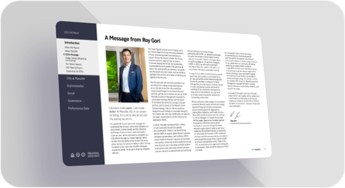 2022 ESG Report Introduction About this Report About Manulife CEO’s Message Global Trends Influencing our Strategy Our Impact Agenda ESG Material Topics Supporting the SDGs ESG at Manulife Environmental Social Governance Performance Data Abbreviations and Acronyms A Message from Roy Gori Decisions made easier . Lives made better . At Manulife, this is our reason for being. It is core to who we are and the journey we are on. As a global life insurer and asset manager, we understand the intrinsic connections between our environment, human health, and the collective well-being of our customers and communities. To do our part, we’ve continued to strengthen our ESG efforts through our Impact Agenda, where we have focused global action around the areas where we have the greatest ability to affect change. On behalf of our more than 40,000 colleagues around the world, I’m proud to share our progress with you. Our Impact Agenda ensures we are staying true to our mission aligned to three interconnected pillars of focus: empowering health and well-being to support the journey towards a better life, driving inclusive economic opportunities to create a more even playing field for all, and accelerating a sustainable future to preserve the planet we all share. This work benefits our business, our planet, and the people who call it home, and I would like to highlight a few actions we’ve taken to help bring our Agenda to life this year. Over the past year, we have been steadfast in our commitment to making accelerated progress on our Climate Action Plan. We established science-based targets for our General Account portfolio, with the aim to achieve net zero by 2050. Manulife Investment Management expanded its sustainable investing offerings with the launch of the Global Climate Action strategy in Europe and Asia, and the launch of the Manulife Forest Climate strategy in the U.S. We increased our General Account holdings in renewable energy by $2.3 billion year-over-year. Additionally, we reduced our paper consumption by 34.6%, driven by our digitization efforts. In 2022, Manulife contributed $25.1 million in total community investments globally. We committed $1 million to the World Central Kitchen (WCK) to support global disaster response, emergency preparedness, and resiliency. WCK’s unique model for disaster response not only helps communities around the world immediately recover from disasters, but it also helps establish resilient food systems with community-centred solutions that are critical to sustained health and well-being. We also built upon an existing strategic partnership with EVERFI, an education technology innovator that designs scalable digital learning solutions to empower students and organizations to instill knowledge on critical topics. Alongside EVERFI, in 2023, we will launch customized learning modules that students and adults can use to learn more about sustainable investing. In support of our efforts to drive inclusive economic opportunity and accelerate a sustainable future, our new partnership with the National Geographic Society will contribute to safeguard 10 World Heritage Sites from the impacts of climate change. It is also contributing to protect the financial well-being of the communities that depend on these sites for their livelihood, as many serve as a major source of economic resiliency for surrounding communities. We also continue to make progress on our ambition to promote Diversity, Equity, and Inclusion through expanded hiring commitments and education and community support for organizations helping Black, Indigenous, and People of Colour. We provide mandatory unconscious bias training for all our colleagues. In Canada, we launched the first Legacy Space at our Canadian segment headquarters in Waterloo and our global headquarters in Toronto through the Downie Wenjack’s Legacy Space Program as part of our Indigenous Reconciliation journey. In Hong Kong, we now provide life insurance to HIV+ individuals and have made life insurance policies accessible to same sex-partners as part of our mission to build an inclusive and equitable society. Finally, in the U.S., we launched a micro-aggression training pilot for our leaders, which we will be rolling out in 2023 in Canada. As I look ahead to 2023, we are prioritizing our contributions to a more nature-positive world through the development and scaling of nature-based solutions to climate change resiliency for our clients and in our community. We believe protecting our planet’s health is a shared responsibility and that nature and biodiversity loss is an economic issue that requires urgent action. We are investing in nature and making tangible commitments to hold ourselves accountable in driving meaningful change. For example, in 2022, we certified 100% of our U.S. Manulife Investment Management–managed farmland to Leading Harvest’s third-party sustainability standard, a year ahead of our target. I’m proud of the progress and impact Manulife made in 2022, and, together with our global team, I look forward to accelerating our journey and leading our company to do even more in 2023 as we deliver on our mission – Decisions made easier . Lives made better . Roy Gori President and Chief Executive Officer 5