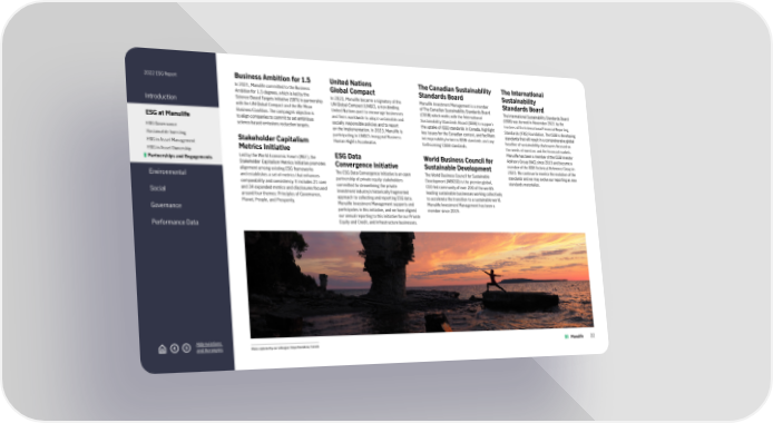 2022 ESG Report Introduction ESG at Manulife ESG Governance Sustainable Investing ESG in Asset Management ESG in Asset Ownership Partnerships and Engagements Environmental Social Governance Performance Data Abbreviations and Acronyms Business Ambition for 1.5 In 2021, Manulife committed to the Business Ambition for 1.5 degrees, which is led by the Science Based Targets initiative (SBTi) in partnership with the UN Global Compact and the We Mean Business Coalition. The campaign’s objective is to align companies to commit to set ambitious science-based emissions reduction targets. Stakeholder Capitalism Metrics Initiative Led by the World Economic Forum (WEF), the Stakeholder Capitalism Metrics initiative promotes alignment among existing ESG frameworks and establishes a set of metrics that enhances comparability and consistency. It includes 21 core and 34 expanded metrics and disclosures focused around four themes: Principles of Governance, Planet, People, and Prosperity. United Nations Global Compact In 2022, Manulife became a signatory of the UN Global Compact (UNGC), a non-binding United Nations pact to encourage businesses and firms worldwide to adopt sustainable and socially responsible policies and to report on the implementation. In 2023, Manulife is participating in UNGC’s inaugural Business Human Rights Accelerator. ESG Data Convergence Initiative The ESG Data Convergence Initiative is an open partnership of private equity stakeholders committed to streamlining the private investment industry’s historically fragmented approach to collecting and reporting ESG data. Manulife Investment Management supports and participates in this initiative, and we have aligned our annual reporting to this initiative for our Private Equity and Credit, and Infrastructure businesses. The Canadian Sustainability Standards Board Manulife Investment Management is a member of The Canadian Sustainability Standards Board (CSSB) which works with the International Sustainability Standards Board (ISSB) to support the uptake of ISSB standards in Canada, highlight key issues for the Canadian context, and facilitate interoperability between ISSB standards and any forthcoming CSSB standards. World Business Council for Sustainable Development The World Business Council for Sustainable Development (WBCSD) is the premier global, CEO-led community of over 200 of the world’s leading sustainable businesses working collectively to accelerate the transition to a sustainable world. Manulife Investment Management has been a member since 2019. The International Sustainability Standards Board The International Sustainability Standards Board (ISSB) was formed in November 2021 by the trustees of the International Financial Reporting Standards (IFRS) Foundation. The ISSB is developing standards that will result in a comprehensive global baseline of sustainability disclosures focused on the needs of investors and the financial markets. Manulife has been a member of the ISSB Investor Advisory Group (IIAG) since 2019 and became a member of the ISSB Technical Reference Group in 2022. We continue to monitor the evolution of the standards and we may evolve our reporting as new standards materialize. Photo captured by our colleague: Vanya Kavrakova, Canada 22