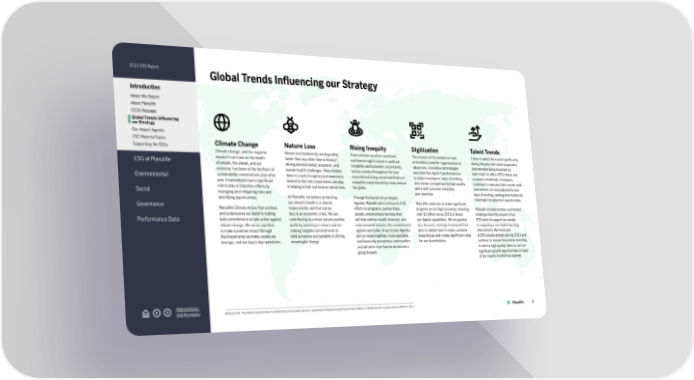 2022 ESG Report Introduction About this Report About Manulife CEO’s Message Global Trends Influencing our Strategy Our Impact Agenda ESG Material Topics Supporting the SDGs ESG at Manulife Environmental Social Governance Performance Data Abbreviations and Acronyms Global Trends Influencing our Strategy Climate Change Climate change, and the negative impact it can have on the health of people, the planet, and our economy, has been at the forefront of sustainability conversations year after year. Corporations have a significant role to play in transition efforts by managing and mitigating risks and identifying opportunities. Manulife’s Climate Action Plan outlines and underscores our belief in making bold commitments to take action against climate change. We are in a position to make a positive impact through the investments we make, assets we manage, and our day-to-day operations. Nature Loss Nature and biodiversity are degrading faster than any other time in history 6 , driving environmental, economic, and human health challenges. Many believe there is a lack of urgency and awareness related to the role corporations can play in helping to halt and reverse nature loss. At Manulife, we believe protecting our planet’s health is a shared responsibility and that nature loss is an economic crisis. We are contributing to a more nature-positive world by investing in nature and are making tangible commitments to hold ourselves accountable in driving meaningful change. Rising Inequity From extreme weather conditions and human rights issues to political instability and economic uncertainty, various events throughout the year exacerbated rising social and financial inequities experienced by many around the globe. Through the launch of our Impact Agenda, Manulife aims to focus its ESG efforts on programs, partnerships, people, and products/services that will help address health, financial, and environmental inequity. Our commitments against each pillar of our Impact Agenda aim to create healthier, more equitable, and financially prosperous communities and will determine how we do business going forward. Digitization The impacts of the pandemic have presented a need for organizations to adopt new, innovative technologies and prioritize digital transformations to adjust employees' ways of working and remain competitive for high-quality talent and customer attraction and retention. Manulife continues to make significant progress on our digital journey, investing over $1 billion since 2018 to boost our digital capabilities. We are guided by a focused, strategic framework that aims to deliver best-in-class customer experiences and create significant value for our shareholders. Talent Trends Labour markets fluctuated significantly during the year, with talent acquisition and retention being impacted by both return-to-office (RTO) trends and economic headwinds. Employees continued to reassess their current work environment as many adjusted to new ways of working, seeking more balanced, meaningful employment opportunities. Manulife introduced new, customized employee benefits as part of our RTO plans to support our people in navigating a new hybrid-working environment. We hired over 8,000 people globally during 2022 and continue to remain focused on investing in diverse high-quality talent as we see significant growth opportunities in many of the regions in which we operate. 6 Based on the "The Global Assessment Report on Biodiversity and Ecosystem Services" released by the Intergovernmental Science-Policy Platform on Biodiversity and Ecosystem Services (IBPES) in 2019. 6