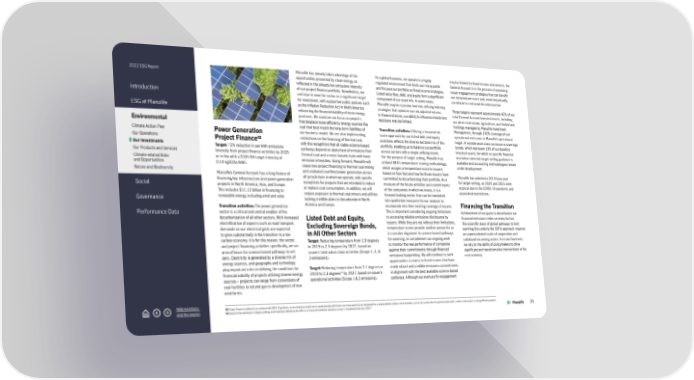 2022 ESG Report Introduction ESG at Manulife Environmental Climate Action Plan Our Operations Our Investments Our Products and Services Climate-related Risks and Opportunities Nature and Biodiversity Social Governance Performance Data Abbreviations and Acronyms Power Generation Project Finance 42 Target: 72% reduction in per kWh emissions intensity from project finance activities by 2035 or in line with a 2035 IEA target intensity of 0.14 kgCO2e/kWh. Manulife’s General Account has a long history of financing key infrastructure and power generation projects in North America, Asia, and Europe. This includes $11.12 billion in financing to renewable energy, including wind and solar. Transition activities: The power generation sector is a critical and central enabler of the decarbonization of all other sectors. With increased electrification of aspects such as road transport, demands on our electrical grids are expected to grow substantially in the transition to a low carbon economy. It is for this reason, the sector, and project financing activities specifically, are an area of focus for science-based pathways to net zero. Electricity is generated by a diverse mix of energy sources, and geography and technology play important roles in defining the conditions for financial viability of projects utilizing cleaner energy sources – projects can range from conversions of coal facilities to natural gas to development of new wind farms. Manulife has already taken advantage of the opportunities presented by clean energy, as reflected in the already low emissions intensity of our project finance portfolio. Nonetheless, we continue to view the sector as a significant target for investment, with supportive public policies such as the Inflation Reduction Act in North America enhancing the financial viability of clean energy positions. We maintain our focus on projects that displace lower efficiency energy sources like coal that best match the long-term liabilities of our business model. We are also implementing restrictions on the financing of thermal coal, with the recognition that all viable science-based pathways depend on abatement of emissions from thermal coal and a move towards fuels with lower emission intensities. Going forward, Manulife will cease new project financing to thermal coal mining and unabated coal-fired power generation across all jurisdictions in which we operate, with specific exceptions for projects that are intended to reduce or replace coal consumption. In addition, we will reduce exposure to thermal coal miners and utilities lacking credible plans to decarbonize in North America and Europe. Listed Debt and Equity, Excluding Sovereign Bonds, in All Other Sectors Target: Reducing temperature from 2.9 degrees in 2019 to 2.5 degrees by 2027, based on issuer ’s total value chain activities (Scope 1, 2, & 3 emissions). Target: Reducing temperature from 2.7 degrees in 2019 to 2.3 degrees 43 by 2027, based on issuer ’s operational activities (Scope 1 & 2 emissions). As a global business, we operate in a highly regulated environment that limits our risk appetite and focuses our portfolio on fixed-income strategies. Listed securities, debt, and equity form a significant component of our asset mix. In some cases, Manulife may be a passive investor, utilizing indexing strategies that optimize our risk adjusted returns. In these instances, our ability to influence investment decisions may be limited. Transition activities: Utilizing a temperature score approach for our listed debt and equity positions reflects the diverse sectoral mix of this portfolio, enabling us to balance our portfolio across sectors with a single unifying metric. For the purpose of target-setting, Manulife has utilized SBTi’s temperature scoring methodology, which assigns a temperature score to issuers based on how fast and how far those issuers have committed to decarbonizing their portfolio. As a measure of the future ambition and commitments of the companies in which we invest, it is a forward-looking metric that can be translated into qualitative measures for our analysts to incorporate into their existing coverage of issuers. This is important considering ongoing limitations to accessing reliable emissions disclosures by issuers. While they are not without their limitations, temperature scores provide another avenue for us to consider alignment to science-based pathways for warming, to complement our ongoing work to monitor the real performance of companies against their commitments through financed emissions footprinting. We will continue to seek opportunities to invest in listed issuers that have made robust and credible emissions commitments, in alignment with the best available science-based pathways. Although our avenues for engagement may be limited for fixed-income instruments, the General Account is in the process of assessing issuer engagement strategies that can benefit our temperature score and, more importantly, contribute to real word decarbonization. These targets represent approximately 42% of our total General Account invested assets, including our direct real estate, agriculture, and timberland holdings managed by Manulife Investment Management, through 100% coverage of our operational emissions in Manulife’s operational target. A notable asset class exclusion is sovereign bonds, which represent 19% of our baseline invested assets, for which no specific financial institution-oriented target-setting guidance is available and accounting methodologies remain under development. Manulife has selected a 2019 base year for target-setting, as 2020 and 2021 were atypical due to the COVID-19 pandemic and associated restrictions. Financing the Transition Achievement of our goals to decarbonize our financed emissions relies on many factors. The scientific basis of global pathways to limit warming that underly the SBTi’s approach requires an unprecedented scale of cooperation and collaboration 