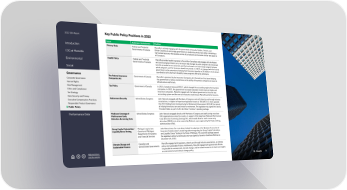 2022 ESG Report Introduction ESG at Manulife Environmental Social Governance Corporate Governance Human Rights Risk Management Ethics and Compliance Tax Strategy Data Security and Privacy Executive Compensation Practices Responsible Product Governance Public Policy Performance Data Abbreviations and Acronyms Key Public Policy Positions in 2022 Issue Audience/Jurisdiction Position Privacy/Data Federal and Provincial Governments of Canada Manulife is actively engaging with the government of Canada, Québec, Ontario, and British Columbia to encourage governments to modernize privacy laws while maintaining a harmonized approach that applies across all jurisdictions and ensures similar laws apply to all Canadians. Health Policy Federal and Provincial Governments of Canada Manulife provides health insurance to five million Canadians and engages with the federal and provincial governments to try to ensure that changes to public programs do not disrupt benefits provided to our customers and that customers can more easily navigate between public programs and the insurance benefit we provide. In 2022, we engaged with the federal government on the extension of employment insurance benefits to 26 weeks to try to ensure coordination with short-term disability leave programs offered by employers. The Federal Insurance Companies Act Government of Canada Manulife is governed by the Insurance Companies Act (Canada) and has been lobbying the government to remove restrictions on the ability of insurance companies to invest in infrastructure and fintech. Tax Policy Government of Canada In 2023, Canada introduced IFRS17, which changed the accounting regime for insurance companies. In 2022, the government increased corporate income taxes on banks and insurance companies. Manulife engaged with the federal government on how the new accounting system and the new tax measures would impact Manulife and other insurers. Retirement Security United States Congress John Hancock engaged with Members of Congress and staff, directly and through industry associations, in support of bipartisan legislation known as “SECURE 2.0,” which updated the 2019 Setting Every Community Up for Retirement Enhancement (SECURE) Act aimed at helping Americans save and invest for retirement. The legislation was signed into law by President Biden as part of a $1.66 trillion “omnibus” spending package. Medicare Coverage of Multi-cancer Early Detection Screening Tests United States Congress John Hancock engaged directly with Members of Congress and staff, joining more than 400 organizations across the country, in support of the bipartisan Medicare Multi-Cancer Early Detection Screening Coverage Act, which would allow for multi-cancer early detection (MCED) tests to be covered by Medicare, upon approval by the Food and Drug Administration (FDA). Group Capital Calculation/ Liquidity Stress Testing Michigan Legislature; Governor of Michigan; Department of Insurance and Financial Services John Hancock was the main driver behind the adoption of the National Association of Insurance Commissioner ’s model legislation integrating the Group Capital Calculation and Liquidity Stress Testing in the State of Michigan. The seven-bill package passed the legislature almost unanimously and was signed by Governor Gretchen Whitmer on December 28, 2022. Climate Change and Sustainable Finance Canadian and United States Governments Manulife engaged with regulators, directly and through industry associations, on climate policy and sustainable finance. Additionally, Manulife engaged with government officials responsible for environment, climate change, and/or natural resources to share our insights on environmental and climate change policy. 79
