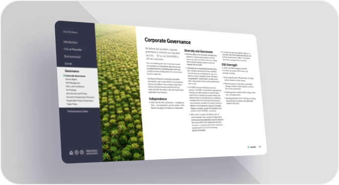 2022 ESG Report Introduction ESG at Manulife Environmental Social Governance Corporate Governance Human Rights Risk Management Ethics and Compliance Tax Strategy Data Security and Privacy Executive Compensation Practices Responsible Product Governance Public Policy Performance Data Abbreviations and Acronyms Corporate Governance We believe that excellent corporate governance is critical to our long-term success — for us, our shareholders, and our customers. Our sustainability governance framework enables us to achieve our sustainability objectives across our global franchise, facilitating easier and more strategic decision-making within the context of our business objectives. Our Board of Directors is elected by Manulife’s shareholders and is responsible for overseeing the business and affairs of our company. Governance policies and practices are consistent with our values and with the various rules and requirements applicable to our business. Independence • Other than the CEO, all Directors – including the Chair – are independent, and all members of the Board’s standing committees are independent Diversity and Succession • Directors reflect a mix of certain competencies, experience, and personal qualities to ensure proper oversight and effective decision-making and the Board routinely reviews its size and makeup with the CGNC. • The Board has a long-standing diversity policy that considers characteristics that contribute to board diversity, including gender, age, race, ethnicity, culture, disability, sexual orientation, and geographic representation, as well as any other characteristics that may be identified from time to time. • The CGNC oversees the Board succession process. The CGNC is committed to equitable and inclusive recruitment practices and will require search firms to identify and present diverse and balanced slates of potential director candidates, including those from underrepresented groups such as women, members of a visible minority as defined in the Employment Equity Act (Canada), Indigenous peoples, people with disabilities and members of the 2SLGBTQ+ community. • With respect to gender, the Board strives to maintain gender parity among the independent directors and has established a specific objective that at least 40% of the independent directors are women, recognizing that board composition may fluctuate from time to time during periods of transition. • To maintain an appropriate gender balance, no more than 60% of the independent directors will be from any one gender, subject to temporary fluctuations during periods of transition. ESG Oversight In 2022, the CGNC engaged in a number of activities pertaining to ESG reviews and oversight, including: • Overseeing Manulife’s ESG framework, including matters related to climate change • Reviewing updates to Manulife’s sustainability strategy, include the Impact Agenda, as well as focus areas and direction • Reviewing reports related to ESG strategy, trends, risks, and opportunities • Reviewing Manulife’s 2021 ESG Report including key performance indicators and stakeholder feedback ESG report 68
