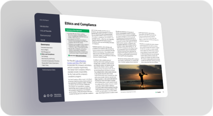 2022 ESG Report Introduction ESG at Manulife Environmental Social Governance Corporate Governance Human Rights Risk Management Ethics and Compliance Tax Strategy Data Security and Privacy Executive Compensation Practices Responsible Product Governance Public Policy Performance Data Abbreviations and Acronyms Ethics and Compliance Summary of Our Approach • Our Code of Business Conduct and Ethics affirms the company’s commitment to ethical conduct, complying with all applicable laws, and avoiding conflicts of interest. • All employees and members of our Board of Directors receive training and must certify their compliance with the Code annually. • Employees are encouraged to report compliance concerns to their manager or members of our Compliance, Legal, or Human Resources team. • We also offer a confidential, toll-free Ethics Hotline or online platform, managed by a third-party service provider, for reports of any unprofessional, illegal, or fraudulent matters. Learn more: Ethics and Compliance The Manulife Code of Business Conduct and Ethics (the Code) incorporates the company’s anti-bribery and anti-corruption requirements. The Global Chief Compliance Officer ’s mandate includes responsibility for the Code and the company’s compliance program. The Chief Compliance Officer reports to the Board of Director ’s Audit Committee at least quarterly on the monitoring of compliance matters, including anti-bribery and anti-corruption. Additionally, all employees are responsible for complying with the Code, which includes anti-bribery and anti-corruption requirements. Our employees and all members of Manulife’s Board of Directors received training and must certify their compliance with the Code annually, be well-versed in its provisions, and conduct themselves according to both the letter, and the spirit of those provisions. We also provide training on ethical standards for all employees, including part time employees and contingent workers – where their role is applicable. Failure to comply with the Code can result in disciplinary action up to and including termination of employment. Facilitation payments, a form of bribery and/ or kickback, are considered unfair and unethical business practices that are prohibited by Manulife wherever we do business. This prohibition would apply not only to Manulife employees but also to consultants, vendors, or any third-party conducting business on behalf of Manulife. In addition to other available avenues of reporting, which include speaking with a direct manager, legal, compliance, human resources and employee relations, the Manulife and John Hancock Ethics Hotline is toll-free, available 24-hours per day, seven days per week, and can be used anonymously, if the person so chooses. The confidential Ethics Hotline enables employees to ask questions about the Code or report suspected misconduct and is maintained by a third- party service provider. Unethical, unprofessional, illegal, fraudulent, or other questionable behaviour, including any concern with respect to auditing and accounting matters, may be reported through the confidential Ethics Hotline. Concerns received via the Ethics Hotline related to auditing or accounting matters will be forwarded to Manulife’s Audit Committee by the Global Compliance Chief. In 2022, we made updates to our Ethics Hotline page, streamlining the process to submit a report. Manulife has established a strong system of internal controls globally to ensure a consistent risk assessment of new customers and application of customer due diligence commensurate with the assessment of risk, which at a minimum is a review of government issued IDs and scanning the prospective customer ’s name against the relevant global sanctions watchlists. All Manulife initial and ongoing relationships, including customers, employees, vendors, Board members, etc., are subjected to varying levels of due diligence based on our assessment of risk. Our onboarding and ongoing monitoring of these relationships are consistent with regulatory requirements and our Anti-Money Laundering (AML) and Anti-Terrorist Financing (ATF) policy and guidelines. We have been utilizing well-known AML compliance and customer screening tools, at a company-wide level, to facilitate ongoing customer transaction monitoring and watchlist name scanning. These systems and supporting processes are designed to identify unusual or suspicious customer transactions to enable reviews, due diligence, and accurate and timely reporting to the appropriate regulator(s). Manulife has a comprehensive system of internal controls designed and executed in accordance with our AML/ATF policy and standards to mitigate the risks that our products or services could be used to support any criminal activity or facilitate money laundering. To ensure our key controls are effectively designed and executed, Manulife provides ongoing mandatory company-wide training to our employees and subjects our AML/ ATF controls to ongoing quality assurance testing coupled with independent monitoring and testing from our Second and Third Lines of defense. Photo captured by our colleague: Nguyen Thi Lan, Vietnam 72