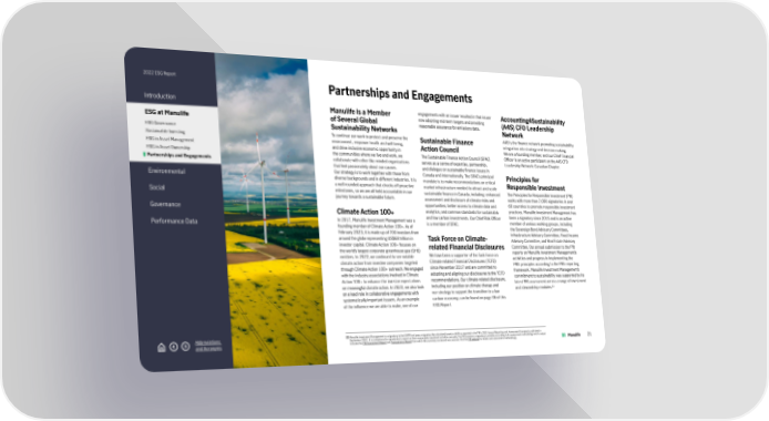 2022 ESG Report Introduction ESG at Manulife ESG Governance Sustainable Investing ESG in Asset Management ESG in Asset Ownership Partnerships and Engagements Environmental Social Governance Performance Data Abbreviations and Acronyms Partnerships and Engagements Manulife is a Member of Several Global Sustainability Networks To continue our work to protect and preserve the environment, empower health and well-being, and drive inclusive economic opportunity in the communities where we live and work, we collaborate with other like-minded organizations that feel passionately about our causes. Our strategy is to work together with those from diverse backgrounds and in different industries. It is a well-rounded approach that checks off proactive milestones, so we are all held accountable in our journey towards a sustainable future. Climate Action 100+ In 2017, Manulife Investment Management was a founding member of Climate Action 100+. As of February 2023, it is made up of 700 investors from around the globe representing US$68 trillion in investor capital. Climate Action 100+ focuses on the world’s largest corporate greenhouse gas (GHG) emitters. In 2022, we continued to see notable climate action from investee companies targeted through Climate Action 100+ outreach. We engaged with the industry associations involved in Climate Action 100+ to enhance the investor expectations on meaningful climate action. In 2022, we also took on a lead role in collaborative engagements with systematically important issuers. As an example of the influence we are able to make, one of our engagements with an issuer resulted in that issuer now adopting mid-term targets and providing reasonable assurance for emissions data. Sustainable Finance Action Council The Sustainable Finance Action Council (SFAC) serves as a centre of expertise, partnership, and dialogue on sustainable finance issues in Canada and internationally. The SFAC’s principal mandate is to make recommendations on critical market infrastructure needed to attract and scale sustainable finance in Canada, including: enhanced assessment and disclosure of climate risks and opportunities; better access to climate data and analytics; and common standards for sustainable and low carbon investments. Our Chief Risk Officer is a member of SFAC. Task Force on Climate- related Financial Disclosures We have been a supporter of the Task Force on Climate-related Financial Disclosures (TCFD) since November 2017 and are committed to adopting and aligning our disclosures to the TCFD recommendations. Our climate-related disclosure, including our position on climate change and our strategy to support the transition to a low carbon economy, can be found on page 36 of this ESG Report. Accounting4Sustainability (A4S) CFO Leadership Network A4S is the finance network promoting sustainability integration into strategy and decision-making. We are a founding member, and our Chief Financial Officer is an active participant on the A4S CFO Leadership Network: Canadian Chapter. Principles for Responsible Investment The Principles for Responsible Investment (PRI) works with more than 7,000 signatories in over 60 countries to promote responsible investment practices. Manulife Investment Management has been a signatory since 2015 and is an active member of various working groups, including the Sovereign Bond Advisory Committees, Infrastructure Advisory Committee, Fixed Income Advisory Committee, and Real Estate Advisory Committee. Our annual submission to the PRI reports on Manulife Investment Management’s activities and progress in implementing the PRI’s principles according to the PRI’s reporting framework. Manulife Investment Management’s commitment to sustainability was supported by its latest PRI assessment across a range of investment and stewardship modules. 23 23 Manulife In vestment Management is a signatory to the UNPRI and pays a signatory fee calculated based on AUM as reported in the PRI's 2021 Annual Reporting and Assessment Framework, published in September 2022. It is compulsory for signatories to report on their responsible investment activities annually. The PRI assesses a signatory's activities according to its assessment methodology and its output includes the PRI Assessment Report and Transparency Report from which this summary scorecard was sourced. Visit the PRI website for details and assessment methodology. 21