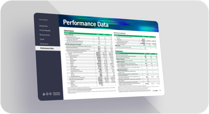 2022 ESG Report Introduction ESG at Manulife Environmental Social Governance Performance Data Abbreviations and Acronyms Performance Data Governance Indicators 2022 2021 2020 Board membership 1 Total board members (#) 13 15 14 Independent board members (#) 12 14 13 Female board members (#) 7 7 6 Racially/ethnically diverse members (#) 3 3 1 Average tenure of board directors (years) 6.4 7.8 8.4 Economic performance and impact Assets Under Management and Administration (AUMA) (C$ trillions) 2 $1.3 $1.4 $1.3 Dividends paid (C$ billions) 3 $2.8 $2.5 $2.3 Goods and services purchased from suppliers (C$ billions) $2.5 $2.4 $2.6 Total income and capital taxes paid (C$ billions) 4 $1.4 $0.8 $1.6 Taxes paid in Canada (C$ thousands) $890,506 $303,142 $350,022 Federal $553,611 $212,563 $280,174 Provincial and territorial $336,895 $90,579 $66,032 British Columbia $39,529 $11,174 $2,587 Alberta $26,065 $621 $4,438 Sasketchewan $4,940 $1,551 $411 Manitoba $6,409 $1,995 $461 Ontario $222,522 $56,255 $46,557 Québec $12,878 $8,349 $10,324 New Brunswick $5,481 $1,806 $340 Nova Scotia $13,220 $6,889 $4,377 Prince Edward Island $968 $286 $51 Newfoundland and Labrador $4,109 $1,476 $255 Yukon $218 $43 $9 Nunavut $202 $14 $3 Northwest Territories $355 $121 $35 Taxes paid in the U.S. (C$ thousands) $305,362 $261,984 $994,694 Taxes paid in Asia (C$ thousands) $231,567 $228,909 $248,156 Hong Kong $103,906 $46,615 $74,071 Japan $45,568 $63,615 $73,908 Singapore $28,306 – – Mainland China $2 – – 1 Data as of February 28, 2023, February 28, 2022, and February 28, 2021. 2 Assets under management and administration is a Non-GAAP Financial Measure. For more information on Non-GAAP and Other Financial Measures, see “Non-GAAP and Other Financial Measures” in MFC’s 2022, Management’s Discussion and Analysis . 3 Includes common and preferred share dividends and other equity distributions. 4 Variation in taxes year over year is primarily due to changes in profitability on a country-by-country basis. Changes in local tax laws in the countries and regions in which we operate are also a factor. Governance (continued) Indicators 2022 2021 2020 Taxes paid in Asia (C$ thousands) (continued) Vietnam $2,179 – – Rest of Asia $51,605 $118,678 $100,177 Taxes paid in other jurisdictions $8,353 – – Other Taxes (C$ thousands) 5 $1,120,336 $1,144,043 $992,648 Total taxes (C$ billions) $2.6 $1.9 $2.6 Public policy Amount spent on political donations (US$) 0 0 0 5 Other taxes include property taxes, business taxes, payroll taxes, premium taxes, investment income taxes, and commodity taxes. Customers Indicators 2022 2021 2020 Total Manulife customers (millions) 34 33 30 Claims and other benefits paid to customers (C$ billions) $35 $32 $32 Debt financing authorized (C$ billions) $5 $8 $8 Customer experience Global customer Net Promoter Score (NPS) 20 21 12 Complaint resolution Cases investigated by Manulife's Ombuds Office (#) 1 189 289 307 Cases investigated by an independent complaint resolution body or regulator (#) 2 55 78 76 Cases investigated that resulted in a recommendation different from Manulife's position (#) 0 0 0 Data Security and Privacy Number of substantiated privacy complaints from a regulatory body 0 0 0 Number of complaints received from outside parties and substantiated by Manulife 3 0 – – Percentage of eligible employees who completed privacy and information security training 100% 99.4% 99.6% Information security breaches or other cyber security incidents 4 0 – – Data breaches 5 0 – – Customers and employees affected by data breaches 0 – – Number of phishing simulation tests conducted globally with Manulife employees and contractors 357,543 336,129 337,138 1 Canadian segment insurance product and services and Manulife Investment Management Guaranteed products. 2 Represents cases investigated by OmbudService for Life and Health Insurance, Ombudsman for Banking Services and Investments, or Autorité des marchés financiers. 3 In 2022, Manulife did not receive any material privacy complaints and did not experience any material privacy incidents. 4 Manulife did not experience any data incidents that required reporting to global data protection authorities in 2022. 5 A data breach is a security violation or incident that leads to unintended access to sensitive or critical data or its exposure to an unauthorized party. Manulife reports on material data breaches that would require reporting to global data protection authorities. 81