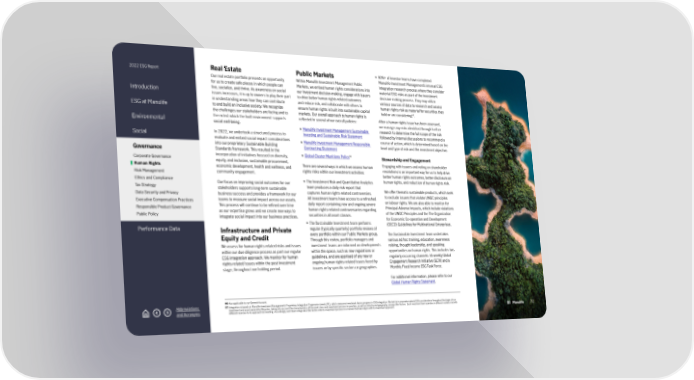 2022 ESG Report Introduction ESG at Manulife Environmental Social Governance Corporate Governance Human Rights Risk Management Ethics and Compliance Tax Strategy Data Security and Privacy Executive Compensation Practices Responsible Product Governance Public Policy Performance Data Abbreviations and Acronyms Real Estate Our real estate portfolio presents an opportunity for us to create safe places in which people can live, socialize, and thrive. As awareness on social issues increases, it is up to owners to play their part in understanding areas how they can contribute to and build an inclusive society. We recognize the challenges our stakeholders are facing and to the extent which the built environment supports social well-being. In 2022, we undertook a structured process to evaluate and embed social impact considerations into our proprietary Sustainable Building Standards framework. This resulted in the incorporation of initiatives focused on diversity, equity, and inclusion, sustainable procurement, economic development, health and wellness, and community engagement. Our focus on improving social outcomes for our stakeholders supports long-term sustainable business success and provides a framework for our teams to measure social impact across our assets. This process will continue to be refined over time as our expertise grows and we create new ways to integrate social impact into our business practices. Infrastructure and Private Equity and Credit We assess for human rights-related risks and issues within our due diligence process as part our regular ESG integration approach. We monitor for human rights-related issues within the post investment stage, throughout our holding period. Public Markets Within Manulife Investment Management Public Markets, we embed human rights considerations into our investment decision-making, engage with issuers to drive better human rights-related outcomes and reduce risk, and collaborate with others to ensure human rights is built into sustainable capital markets. Our overall approach to human rights is reflected in several of our overall policies: • Manulife Investment Management Sustainable Investing and Sustainable Risk Statement • Manulife Investment Management Responsible Contracting Statement • Global Cluster Munitions Policy 66 There are several ways in which we assess human rights risks within our investment activities: • The Investment Risk and Quantitative Analytics team produces a daily risk report that captures human rights-related controversies. All investment teams have access to a refreshed daily report containing new and ongoing severe human rights-related controversaries regarding securities in all asset classes. • The Sustainable Investment team performs regular (typically quarterly) portfolio reviews of every portfolio within our Public Markets group. Through this review, portfolio managers and investment teams are informed on developments within the space, such as new regulations or guidelines, and are apprised of any new or ongoing human rights-related issues faced by issuers or by specific sectors or geographies. • 90% + of investor teams have completed Manulife Investment Management’s internal ESG integration research process where they consider material ESG risks as part of the investment decision-making process. They may utilize various sources of data to research and assess human rights risk as material for securities they hold or are considering 67 . After a human rights issue has been assessed, we manage any risks identified through further research to determine the full scope of the risk followed by internal discussions to recommend a course of action, which is determined based on the level and type of risk and the investment objective. Stewardship and Engagement Engaging with issuers and voting on shareholder resolutions is an important way for us to help drive better human rights outcomes, better disclosure on human rights, and reduction of human rights risk. We offer thematic sustainable products, which seek to exclude issuers that violate UNGC principles on labour rights. We are also able to monitor for Principal Adverse Impacts, which include violations of the UNGC Principles and the The Organization for Economic Co-operation and Development (OECD) Guidelines for Multinational Enterprises. The Sustainable Investment team undertakes various ad hoc training, education, awareness raising, thought leadership, and speaking opportunities on human rights. This includes two regularly occurring channels: Bi-weekly Global Engagement Research Initiative (GERI) and a Monthly Fixed Income ESG Task Force. For additional information, please refer to our Global Human Rights Statement . 66 Also applicable to our Gener al Account. 67 Integr ation is based on Manulife Investment Management’s Proprietary Integration Progression Levels (IPL), which measures investment teams progress in ESG integration. We look to incorporate material ESG considerations throughout the stages of our investment and asset ownership lifecycles, taking into account the characteristics of the asset class and investment process in question, as well as industry and geography, among other factors. Each investment team operates in different markets and with different nuances to its approach to investing. Accordingly, each team integrates ESG factors into its investment process in a manner that best aligns with its investment approach. 70