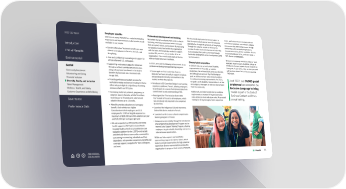 2022 ESG Report Introduction ESG at Manulife Environmental Social Community Investment Volunteering and Giving Financial Inclusion Diversity, Equity, and Inclusion Talent Management Wellness, Health, and Safety Customer Experience and Well-being Governance Performance Data Abbreviations and Acronyms Employee benefits Over recent years, Manulife has made the following expansions and improvements to the benefits made available to our people: • Gender Affirmation Treatment benefits are now offered to employees in Canada, the U.S., and Hong Kong. • Free and confidential counseling and support for all Canadian and U.S. colleagues . • Supporting employees to save for retirement through a defined contribution pension plan, along with optional enrollment in the health benefits that extends into retirement with no age limit. • Providing wellness consultant services for workstation setup assistance including for home office setups in light of a hybrid way of working announced with our RTO plan. • Increasing maternal, paternal, pregnancy, or adoption leave in Canada, with birth mothers receiving up to 20 weeks and paternal and adoption leaves up to 12 weeks. • Manulife provides adoption and surrogacy benefits that reimburses eligible Canadian-domiciled employees and U.S. employees for 100% of eligible expense to a maximum of $20,000 per child adoption per year and $20,000 per surrogacy per year. • We also expanded our DEI benefits and mental health support in 2022 with Included Health. Included Health is the first comprehensive care navigation platform for the LGBTQ+ and racially and ethnically diverse communities communities specializing in connecting individuals and their dependents with provider connections, benefits and coverage support, navigation for trans colleagues, and more. Professional development and training We believe that all employees have a role to play in fostering a working environment where everyone feels accepted, valued, and included. By equipping our people at every level within the organization with the tools and knowledge needed to support positive DEI practices, we are better off as an organization. This commitment starts at the top with our leadership team members. In 2022, we made the following enhancements to our professional development and training programs: • Encouraged our Asia Leadership Team to dedicate five hours annually to support initiatives and activities for minority communities in the market in which they operate. • Introduced a DEI Essentials Badge in our learning experience platform, Pursuit, allowing employees to participate in a course that demonstrates their commitment to and understanding of DEI. • Reassigned the “The Inclusion Starts With You” module in Pursuit to all employees, which was previously only required to be completed by new hires. • Launched the Indigenous Cultural Awareness Online Web Series module in Pursuit. • Launched our first cross-cultural competencies learning program in Pursuit. • Enhanced career mobility through the introduction of an Underwriting Development Program and an Internal Sales Support Training Program, allowing employees to gain valuable knowledge and access internal career opportunities. Within our Asia segment, we launched a sponsorship program for diverse talent, which looks to provide opportunities for high potential talent from diverse representations across the organization to progress their career at Manulife. We also provide high potential women leaders in Asia the opportunity to pursue board directorship accreditation through the University of Hong Kong. Through this initiative, we aim to increase the number of under-represented women in leadership by accelerating their path to promotion through leadership development, stretch assignments, and special projects. Diverse talent acquisition In 2022 in Asia, we set out to have Disability representation of 1% (visible or invisible disabilities). We achieved 0.8% at the end of 2022, and although we were just shy of achieving our goal, we believe we have set a strong foundation to continue increasing representation. For 2023, our goal is 1.5% disability representation to further encourage our managers to seek out diverse talent from the community. Additionally, we implemented diverse candidate requirements to increase hiring and promotion rates at director-level and above roles. We provided training for hiring managers, talent acquisition teams, and human resource business partners on inclusive recruitment and worked to mitigate unconscious bias in the hiring process through partnerships with community organizations focused on recruiting diverse candidates. We also implemented diverse hiring panels and target a 50% diverse candidate slate. We look to increase representation of diverse talent, especially those living with disabilities. In Asia, we introduced a bursary support of up to 10 people for three years. As part of this effort, we have partnered with local recruitment firms to focus on sourcing PWD talent. As of 2022, over 36,000 global employees have completed the Inclusive Language training module as part of the Code of Business Conduct and Ethics annual training. 55