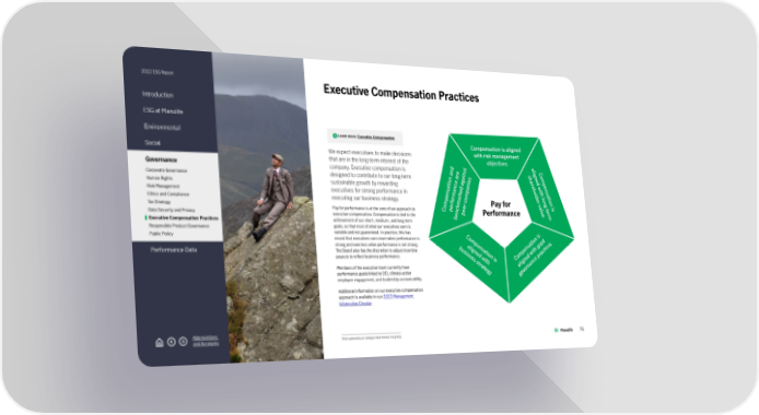 2022 ESG Report Introduction ESG at Manulife Environmental Social Governance Corporate Governance Human Rights Risk Management Ethics and Compliance Tax Strategy Data Security and Privacy Executive Compensation Practices Responsible Product Governance Public Policy Performance Data Abbreviations and Acronyms Executive Compensation Practices Learn more: Executive Compensation We expect executives to make decisions that are in the long-term interest of the company. Executive compensation is designed to contribute to our long-term sustainable growth by rewarding executives for strong performance in executing our business strategy. Pay for performance is at the core of our approach to executive compensation. Compensation is tied to the achievement of our short-, medium-, and long-term goals, so that most of what our executives earn is variable and not guaranteed. In practice, this has meant that executives earn more when performance is strong and earn less when performance is not strong. The Board also has the discretion to adjust incentive payouts to reflect business performance. Members of the executive team currently have performance goals linked to DEI, climate action employee engagement, and leadership accountability. Additional information on our executive compensation approach is available in our 2023 Management Information Circular . Pay for Performance Compensation is aligned with risk management objectives Compensation is aligned with long-term shareholder value Compensation is aligned with good governance practices Compensation is aligned with business strategy Compensation and performance are benchmarked against peer companies Photo captured by our colleague: Basel Kirmani, Hong Kong 76