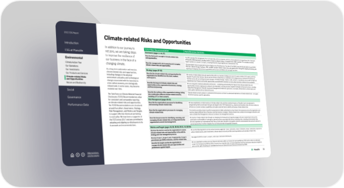 2022 ESG Report Introduction ESG at Manulife Environmental Climate Action Plan Our Operations Our Investments Our Products and Services Climate-related Risks and Opportunities Nature and Biodiversity Social Governance Performance Data Abbreviations and Acronyms Climate-related Risks and Opportunities In addition to our journey to net zero, we are taking steps to improve the resilience of our business in the face of a changing climate. As a long-term underwriter and investor, climate-related risks and opportunities, including changes in the physical environment and policy and technological changes associated with the transition to a low carbon economy, are strategically relevant and, in some cases, may become material over time. The Task Force on Climate-Related Financial Disclosures (TCFD) Recommendations allow for consistent and comparable reporting on climate-related risks and opportunities. The TCFD Recommendations are structured around four pillars: Governance, Strategy, Risk Management, and Metrics and Targets to support effective disclosure pertaining to each pillar. We have been a supporter of the TCFD since 2017 and are committed to adopting and aligning our disclosures to its framework and recommendations. TCFD Pillar/Recommendation Manulife Action Summary Governance (pages 11-14, 37) Describe the board’s oversight of climate-related risks and opportunities. The BRC oversees the management of our principal risks, and our programs, policies, and procedures to manage those risks. Oversight of Manulife’s ESG framework, including matters related to climate change, is included in the CGNC mandate. The committee receives regular updates on relevant ESG topics, including Manulife’s Impact Agenda and Climate Action Plan. Describe management’s role in assessing and managing climate-related risks and opportunities. Climate-related risks are governed at various levels across the enterprise. The roles of the CGNC, Executive Sustainability Council (ESC), ESG CoE, Climate Change Taskforce, ERC, and BRC consider climate-related risks and opportunities through the ongoing monitoring and reporting of emerging risks and are supported by various sub-committees and oversight functions. Strategy (pages 37-42) Describe the climate-related risks and opportunities the organization has identified over the short, medium, and long term. We monitor climate-related risks and opportunities within our business strategy over short (1-5 year), medium (5-15 years), and long (beyond 15 years) time horizons. We do not view climate-related risk as a standalone risk category but as a transversal risk that can manifest across all our existing principal risk types, including strategic, market, credit, product, or operational risk, as well as legal and reputational risk. Product and market opportunities associated with transition to a low-carbon economy continue to be considered. Describe the impact of climate-related risks and opportunities on the organization’s businesses, strategy, and financial planning. We are a long-term oriented underwriter and investor — monitoring and evaluating the impacts from climate-related risks and opportunities remains ongoing and continue to be embedded in existing business segment strategies and group functions, including Global Risk Management, Manulife Investment Management (timberland, agriculture, real estate, infrastructure, private equity and credit, public markets) and our General Account. Describe the resilience of the organization’s strategy, taking into consideration different climate-related scenarios, including a 2°C or lower scenario. Climate-related scenario analysis is conducted at the business unit level to understand implications of climate-related risks – see pages 40-42 for business specific approaches. Risk Management (pages 40-43) Describe the organization’s processes for identifying and assessing climate-related risks. We have established an initial inventory of climate-related risks and their potential impacts on Manulife. Each risk statement is categorized by both our principal risk types and aligned to the TCFD framework (e.g., physical and transition risks). We also continue to enhance our scenario analysis capabilities and explore external tools to identify and assess climate-related risks. Describe the organization’s processes for managing climate-related risks. The inventory provides a basis to perform assessments to better understand our key inherent risk exposures across the organization and how they impact different lines of business and their business strategies. Climate-related risks continue to be managed at business unit level as Global Risk Management continues to enhance risk management practices. Describe how processes for identifying, assessing, and managing climate-related risks are integrated into the organization’s overall risk management. We monitor climate-related risks through our emerging risk framework and regularly engage with senior leadership to discuss the prioritization and feasibility of contingency planning actions associated with various emerging risks, including environmental risks. We also expanded our Environmental Risk Policy to articulate Manulife’s risk appetite related to environmental risks and will continue to pursue approaches to further integrate into our enterprise-wide risk appetite framework. Metrics and Targets (pages 15, 20, 25-26, 29-31, 44, 83-84) Disclose the metrics used by the organization to assess climate-related risks and opportunities in line with its strategy and risk management process. We use the following metrics across various business segments: scope 1 emissions, scope 2 emissions, scope 3 emissions, exposure to carbon-related assets, green investments, climate value at risk and portfolio warming potential, and sovereign climate risks. Disclose Scope 1, Scope 2, and, if appropriate, Scope 3 greenhouse gas (GHG) emissions, and the related risks. See pages 83-84 for scope 1, s