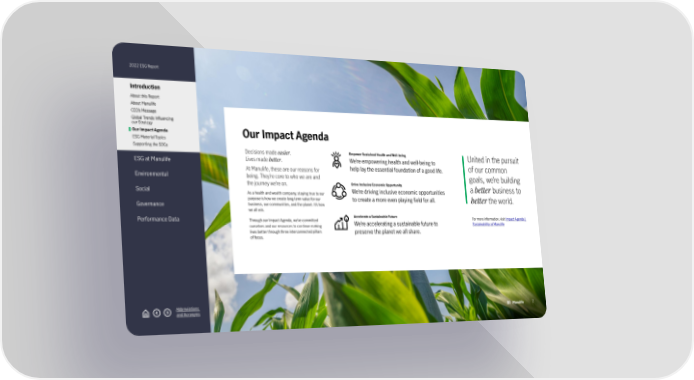 2022 ESG Report Introduction About this Report About Manulife CEO’s Message Global Trends Influencing our Strategy Our Impact Agenda ESG Material Topics Supporting the SDGs ESG at Manulife Environmental Social Governance Performance Data Abbreviations and Acronyms Our Impact Agenda Decisions made easier . Lives made better . At Manulife, these are our reasons for being. They’re core to who we are and the journey we’re on. As a health and wealth company, staying true to our purpose is how we create long-term value for our business, our communities, and the planet. It’s how we all win. Through our Impact Agenda, we’ve committed ourselves and our resources to continue making lives better through three interconnected pillars of focus. Empower Sustained Health and Well-being We’re empowering health and well-being to help lay the essential foundation of a good life. Drive Inclusive Economic Opportunity We’re driving inclusive economic opportunities to create a more even playing field for all. Accelerate a Sustainable Future We’re accelerating a sustainable future to preserve the planet we all share. United in the pursuit of our common goals, we’re building a better business to better the world. For more information, visit Impact Agenda | Sustainability at Manulife 7
